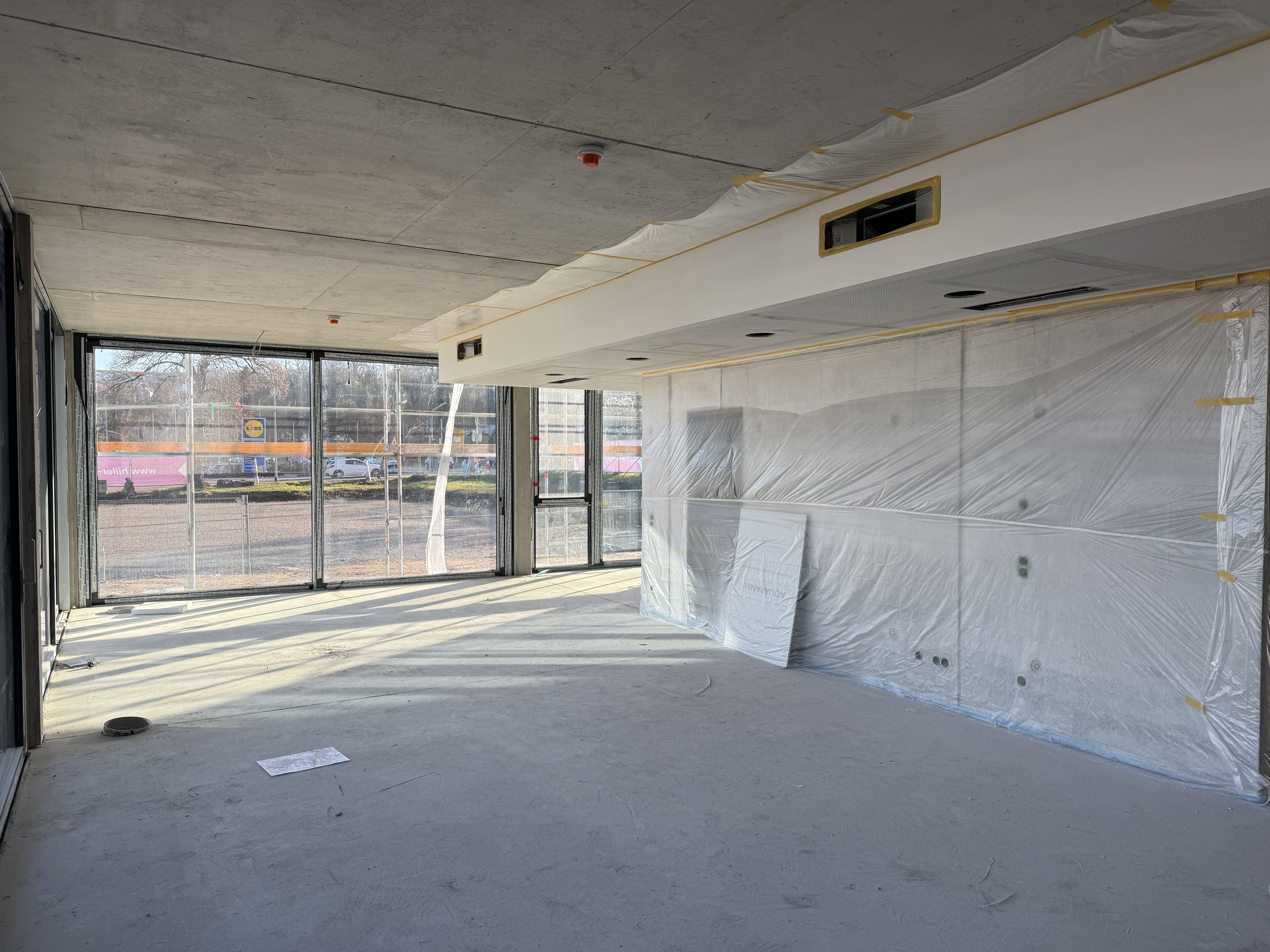 Im Dezember wird es auf der Baustelle etwas ruhiger – der Innenausbau geht dennoch kontinuierlich weiter. Im Erdgeschoss wird die Abhangdecke zunehmend ersichtlich und gibt bereits einen guten Eindruck davon, wie die Räume später wirken werden.