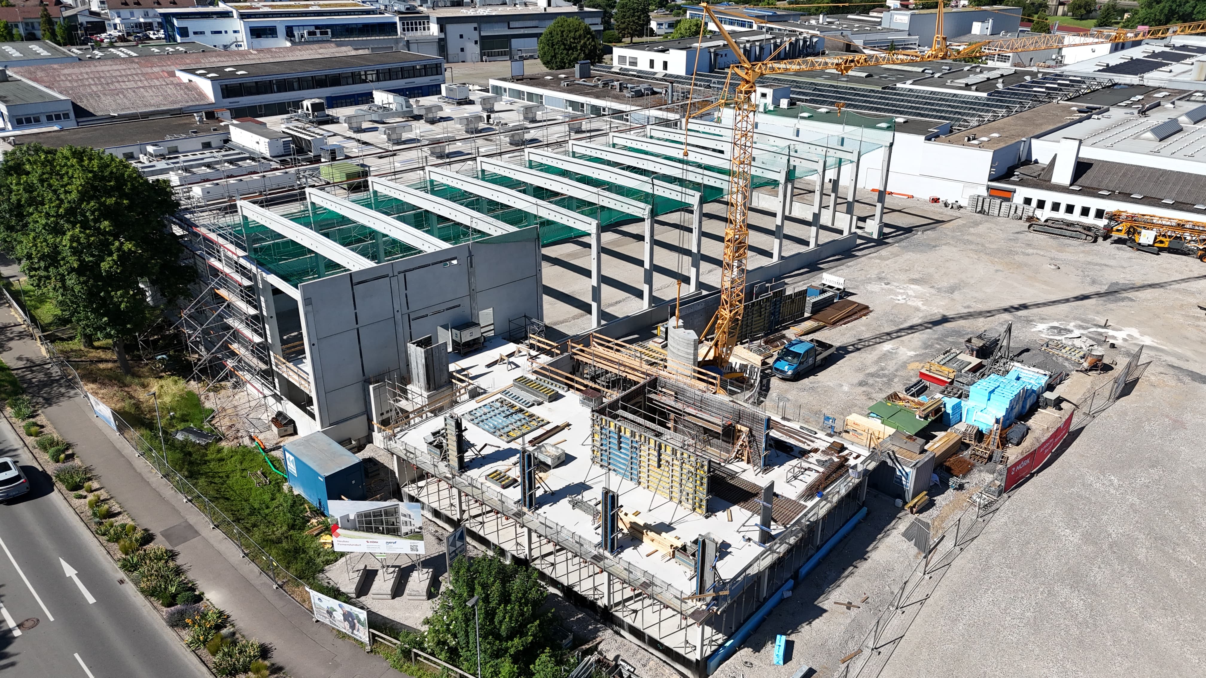 Im Juni nimmt das Bürogebäude weiter klare Konturen an: Der zweite Stock ist jetzt deutlich erkennbar. Hier entstehen künftig Besprechungsräume, Büros für das Produktmanagement und Räumlichkeiten der Geschäftsführung.