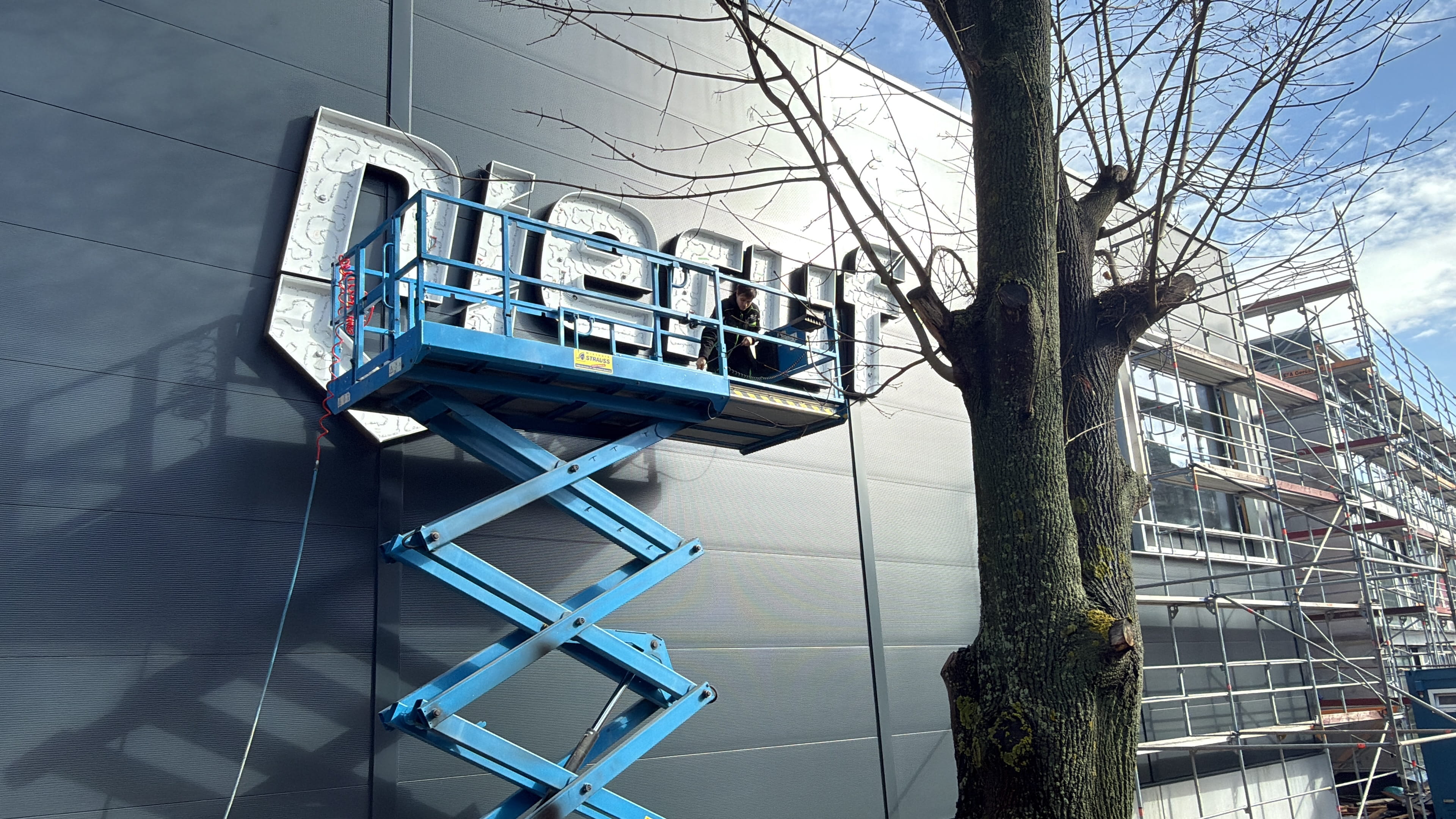 Mit der Montage unseres Logos bekommt der Neubau nun sein Gesicht – und ein weiteres Kapitel unseres Projekts wird sichtbar abgeschlossen.