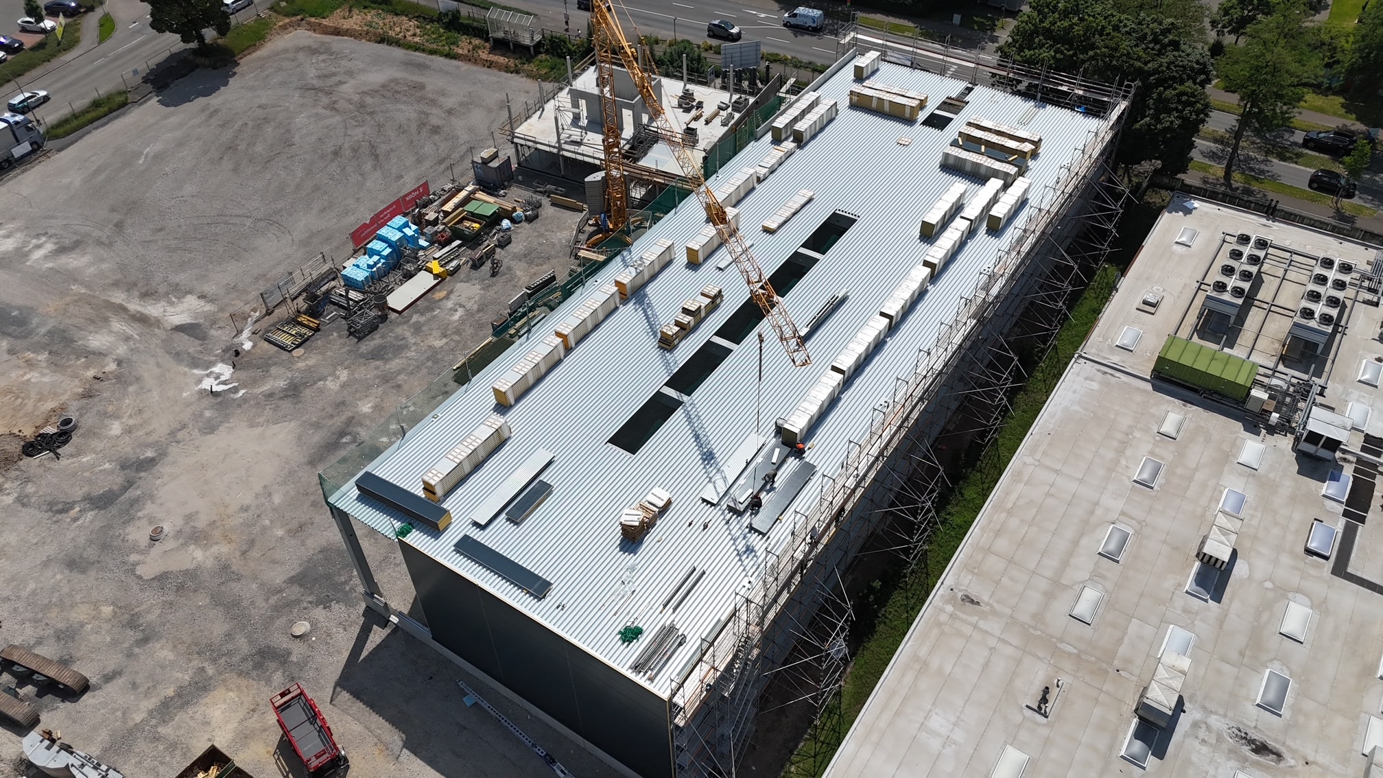Die Halle schreitet ebenfalls kräftig voran: Dach und Dachlichtbänder werden fertiggestellt, während außen Sandwichpaneele in Anthrazit (RAL 7016) und innen in Grau-Weiß (RAL 9002) montiert werden.