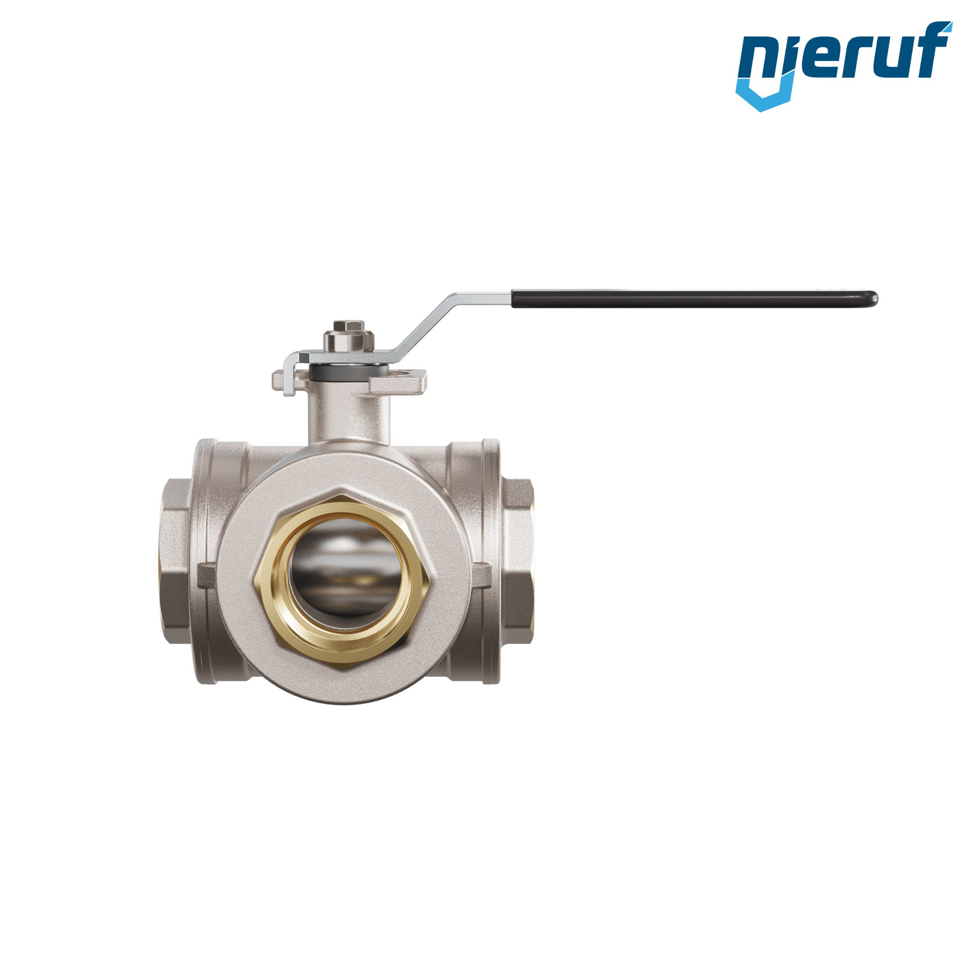 Produktmerkmale: Dreiwege-Kugelhahn aus Messing mit Stopfbuchse und schwimmender Kugel mit T-Bohrung