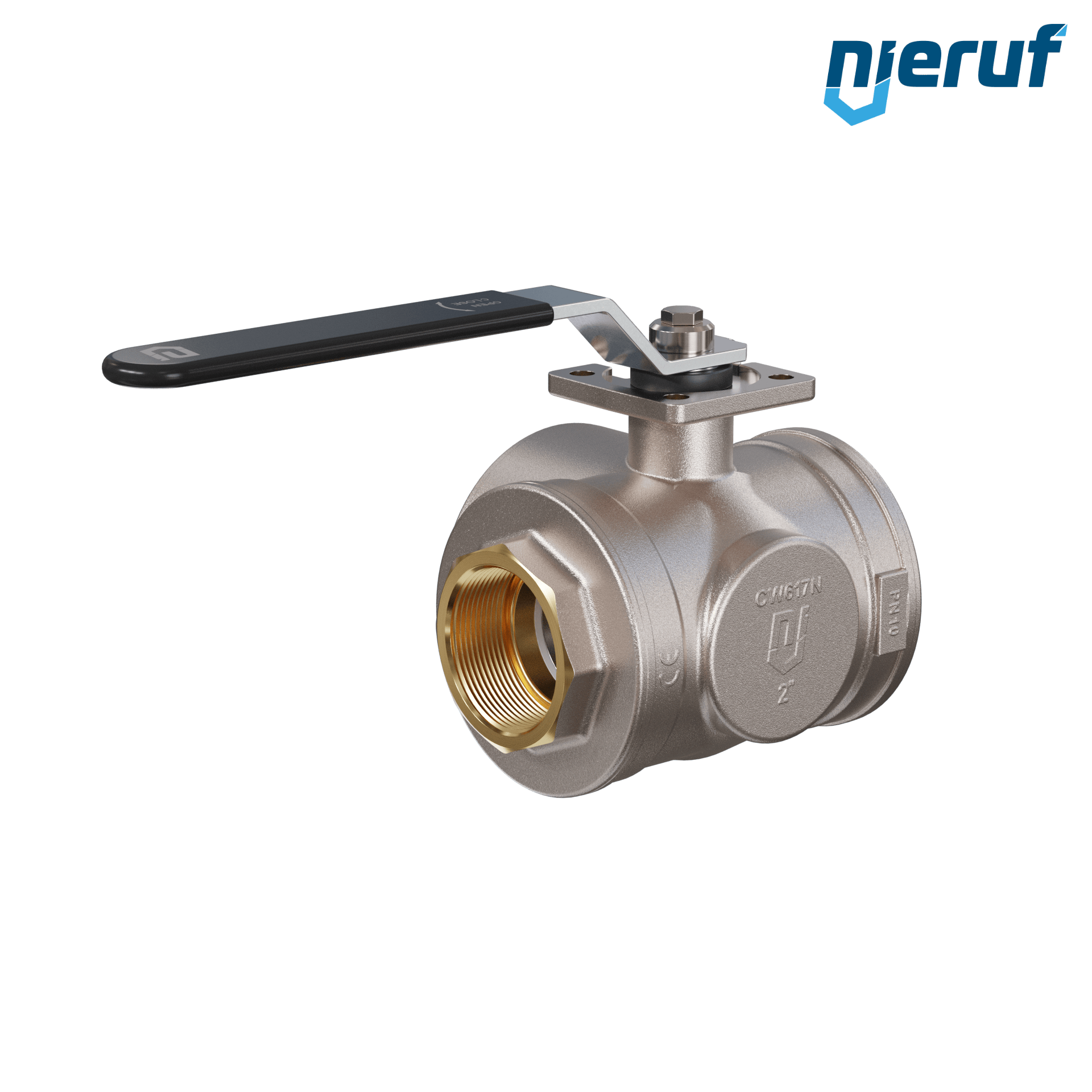 Produktmerkmale Dreiwege-Kugelhahn aus Messing mit Stopfbuchse und schwimmender Kugel mit T-Bohrung