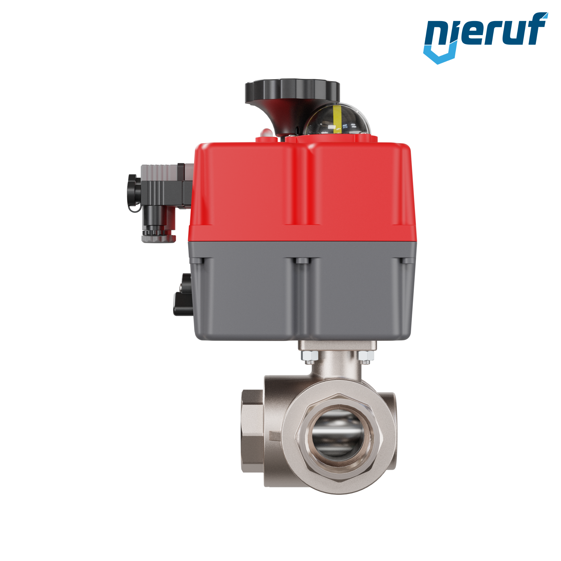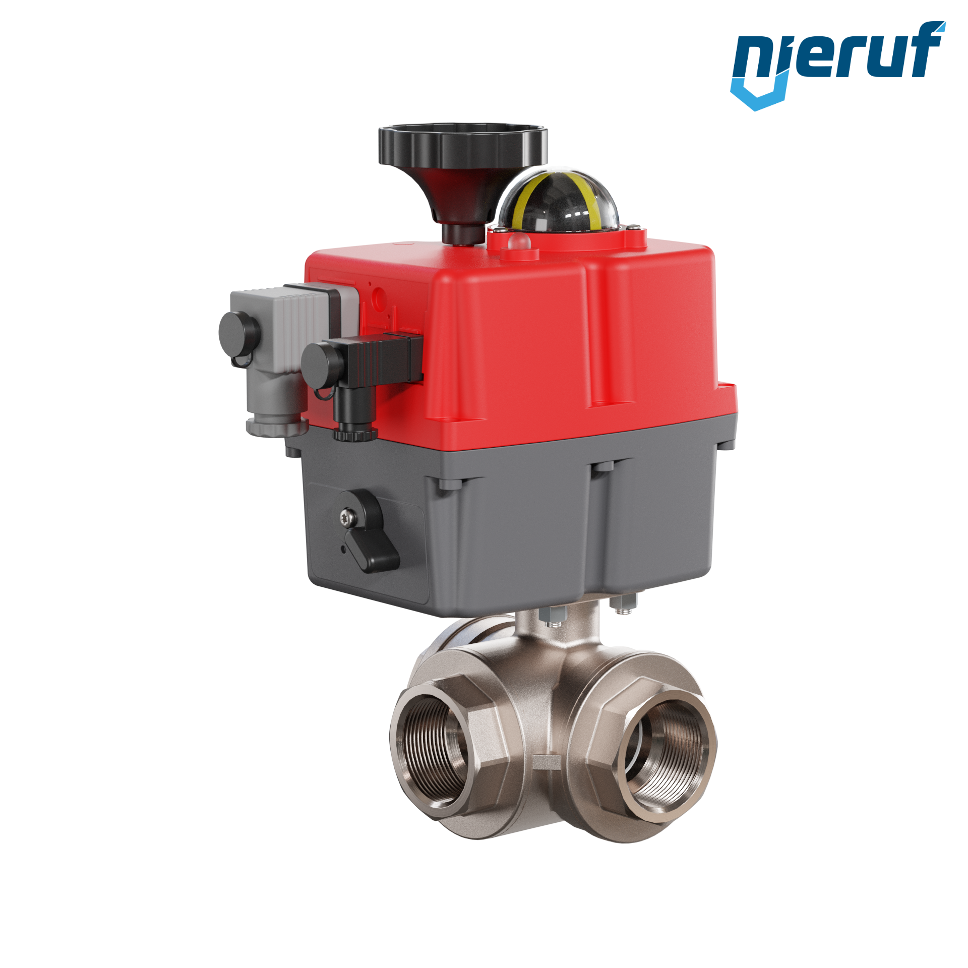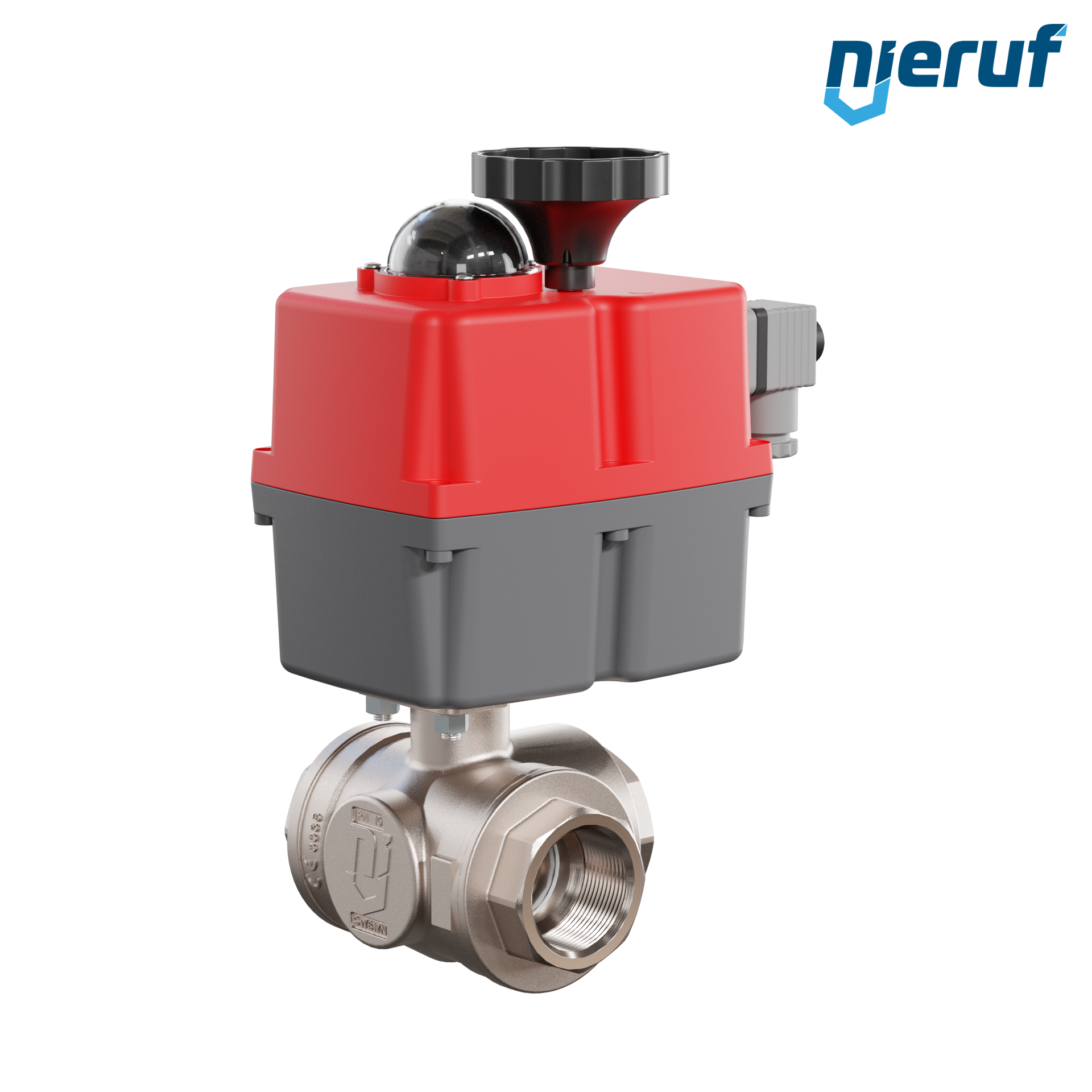 Dieser hoch qualitative Automatik-Muffenkugelhahn aus Messing mit elektronischem Drehantrieb (Serie S) hat eine optische Stellungsanzeige und eine Handnotbetätigung.