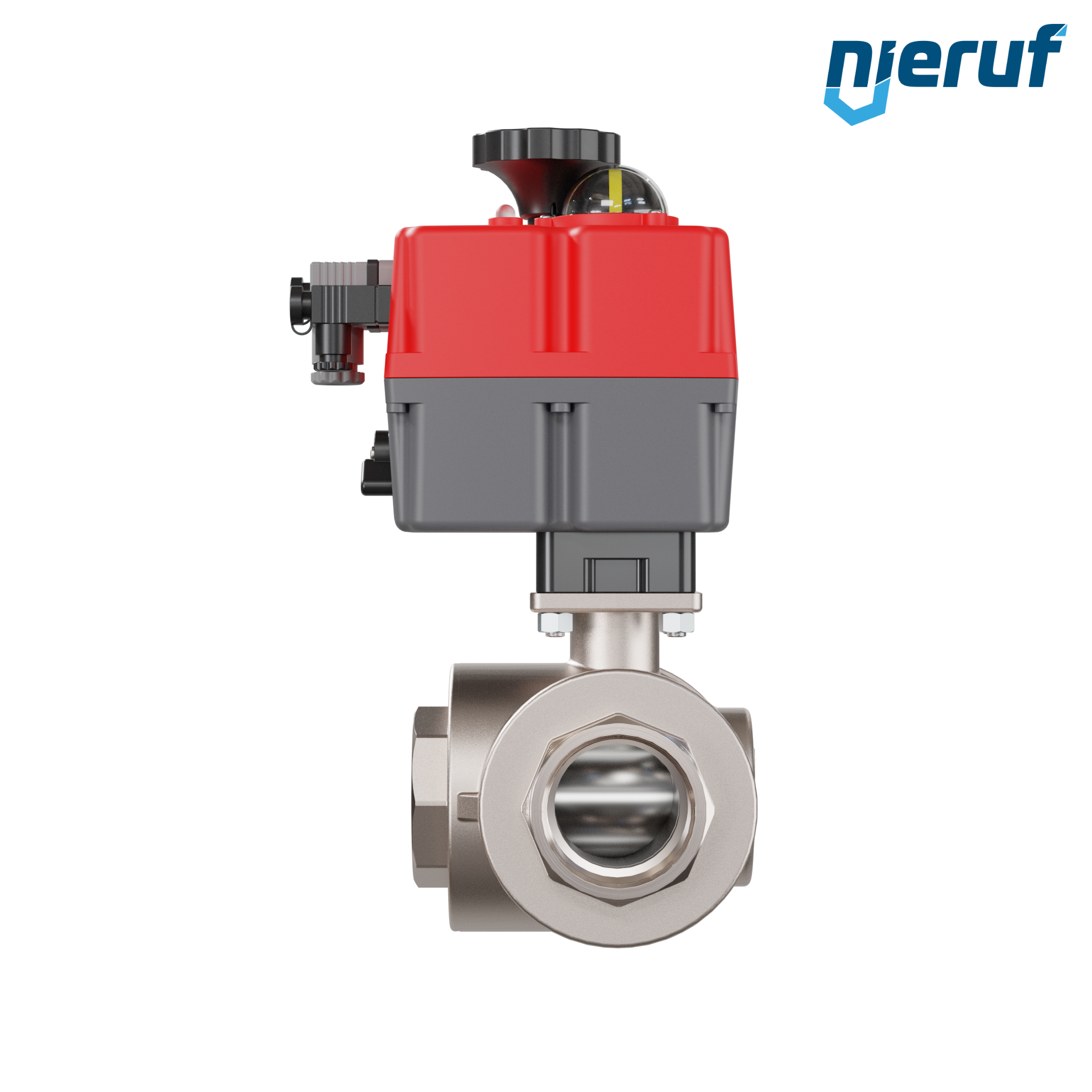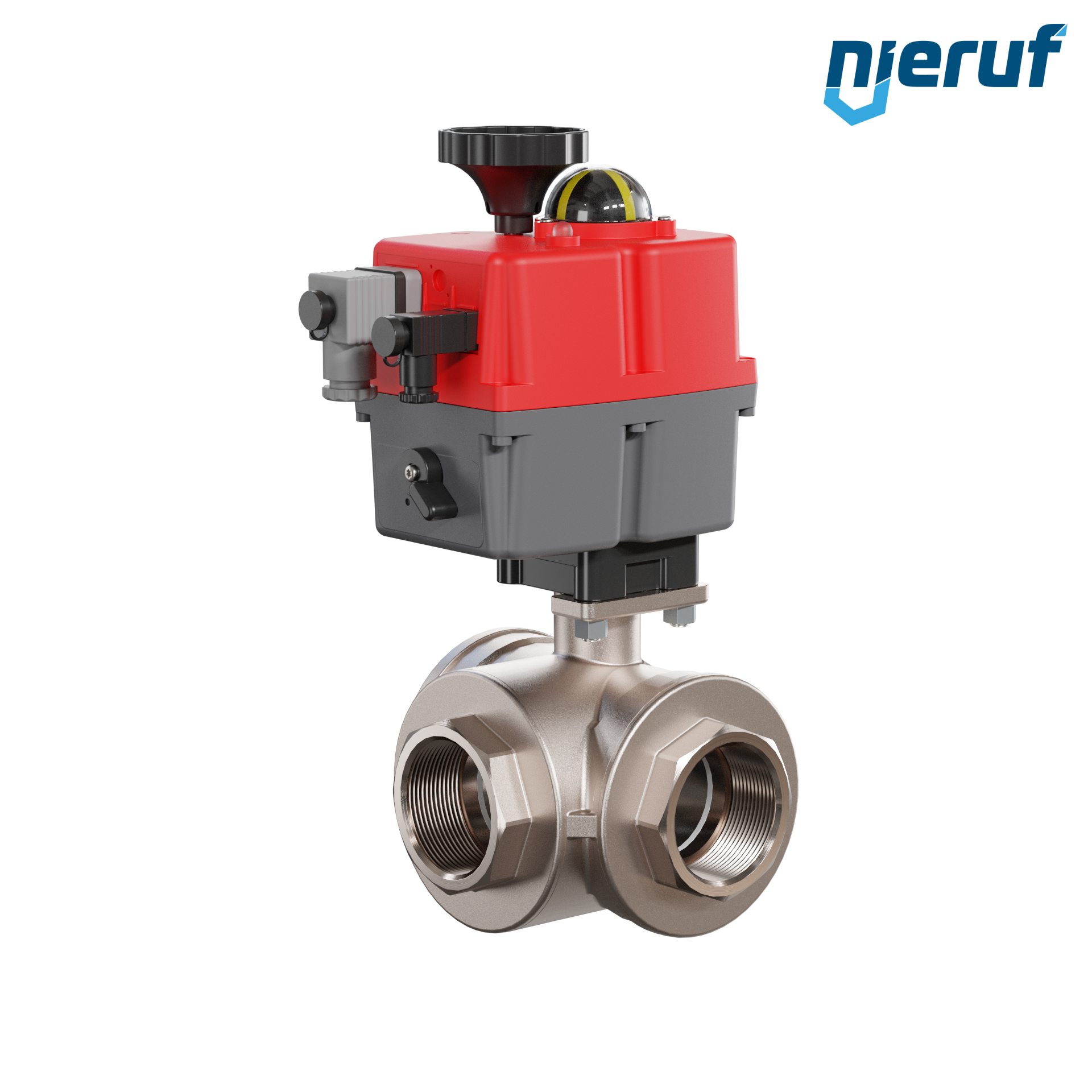 Dieser hoch qualitative Automatik-Muffenkugelhahn aus Messing mit elektronischem Drehantrieb (Serie S) hat eine optische Stellungsanzeige und eine Handnotbetätigung.