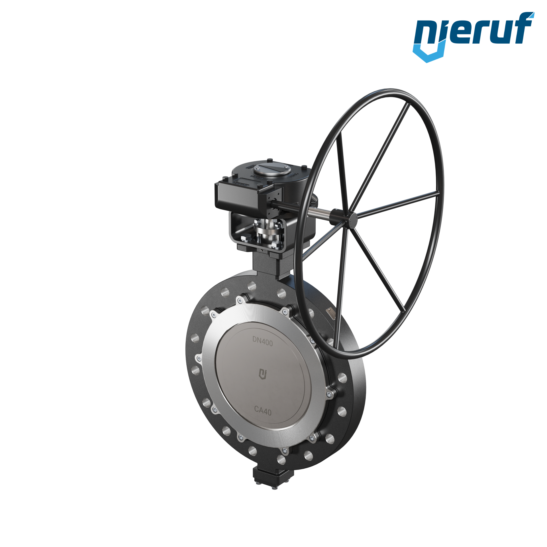 3fach exzentrische Absperrklappe Gewindeaugen AK14 DN 400 PN40 mit Gehäuse aus Stahlguss max. 25 bar Getriebe
