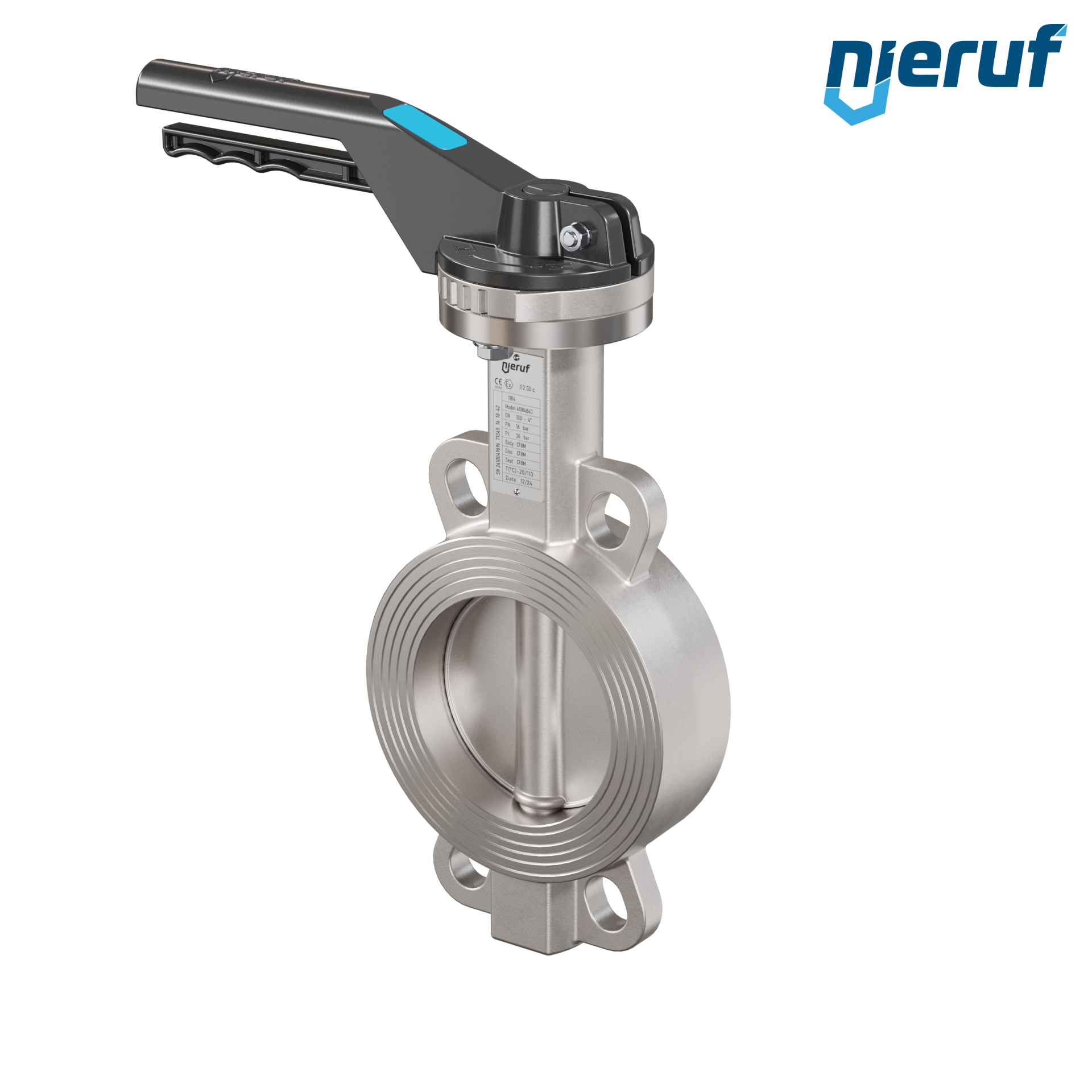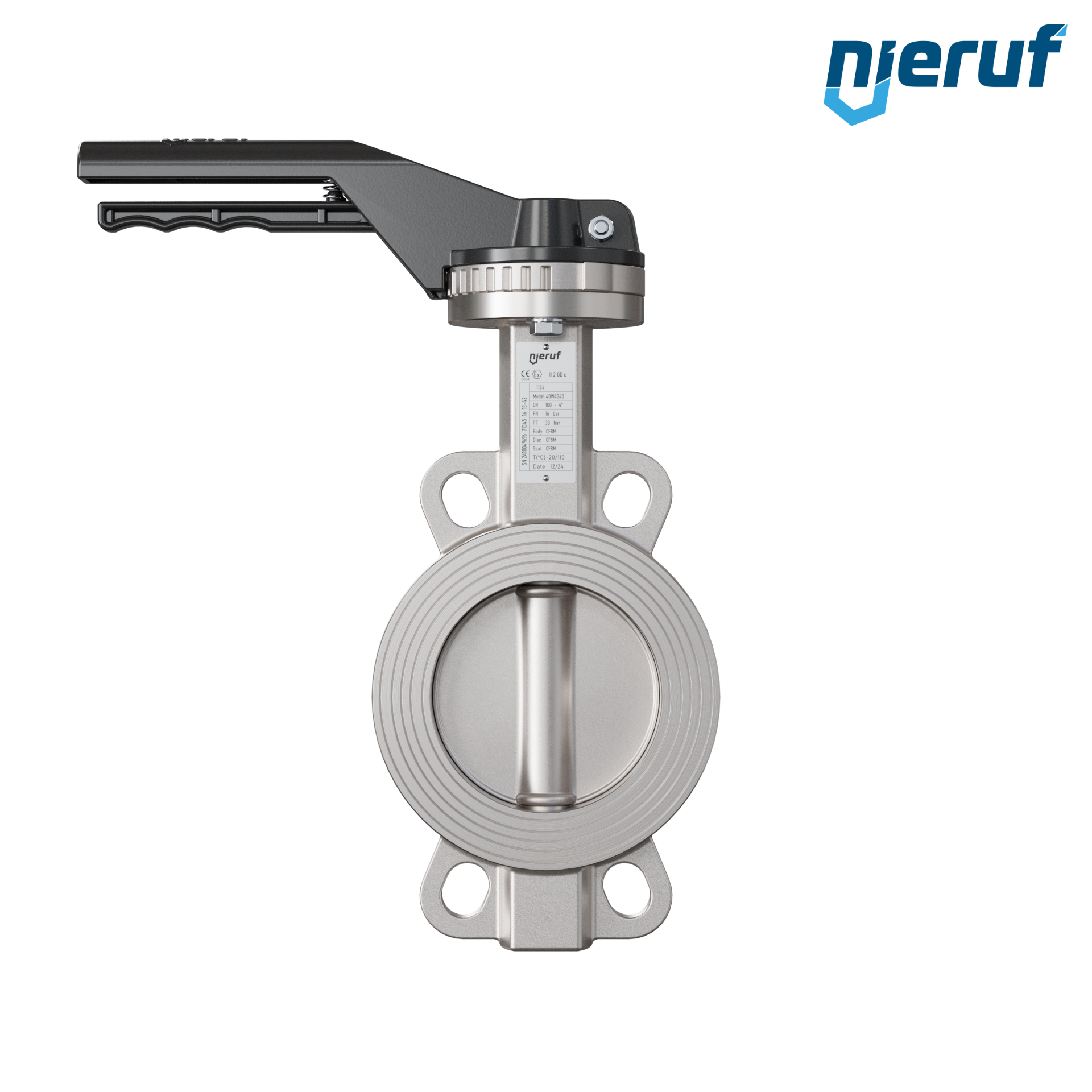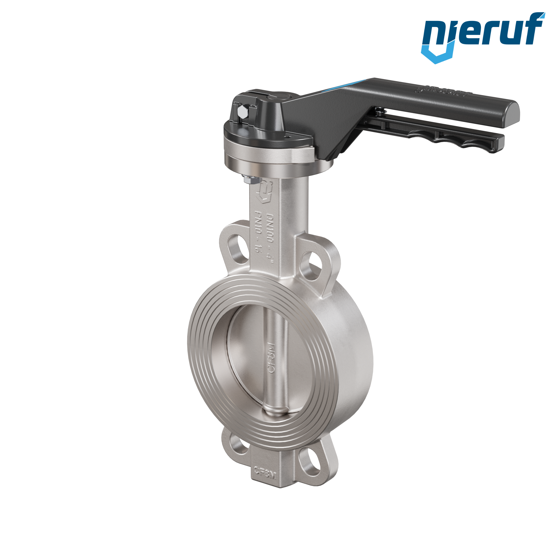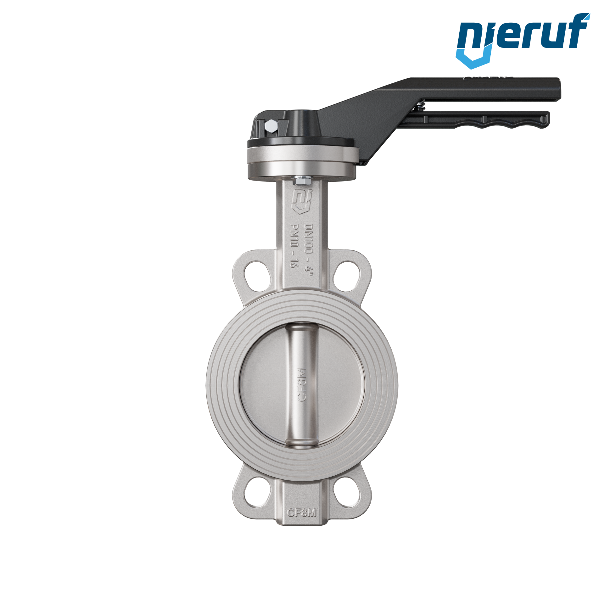 Edelstahl-Absperrklappe DN 100 PN16 mit Zentrieraugen Gehäuse aus Edelstahl 1.4408 Klappenscheibe aus Edelstahl 1.4408 mit Handhebel und Dichtung aus metall