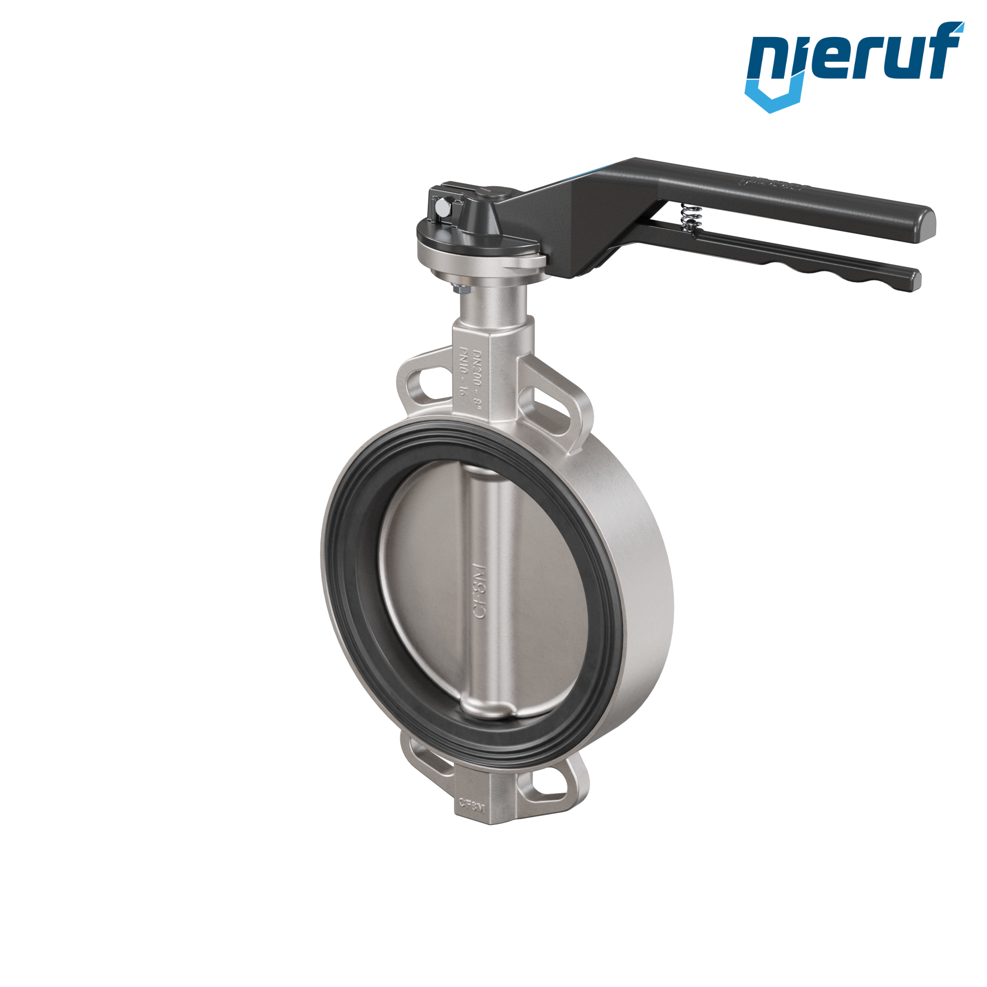 Edelstahl-Absperrklappe DN 200 PN16 mit Zentrieraugen Gehäuse aus Edelstahl 1.4408 Klappenscheibe aus Edelstahl 1.4408 mit Handhebel und Dichtung aus EPDM