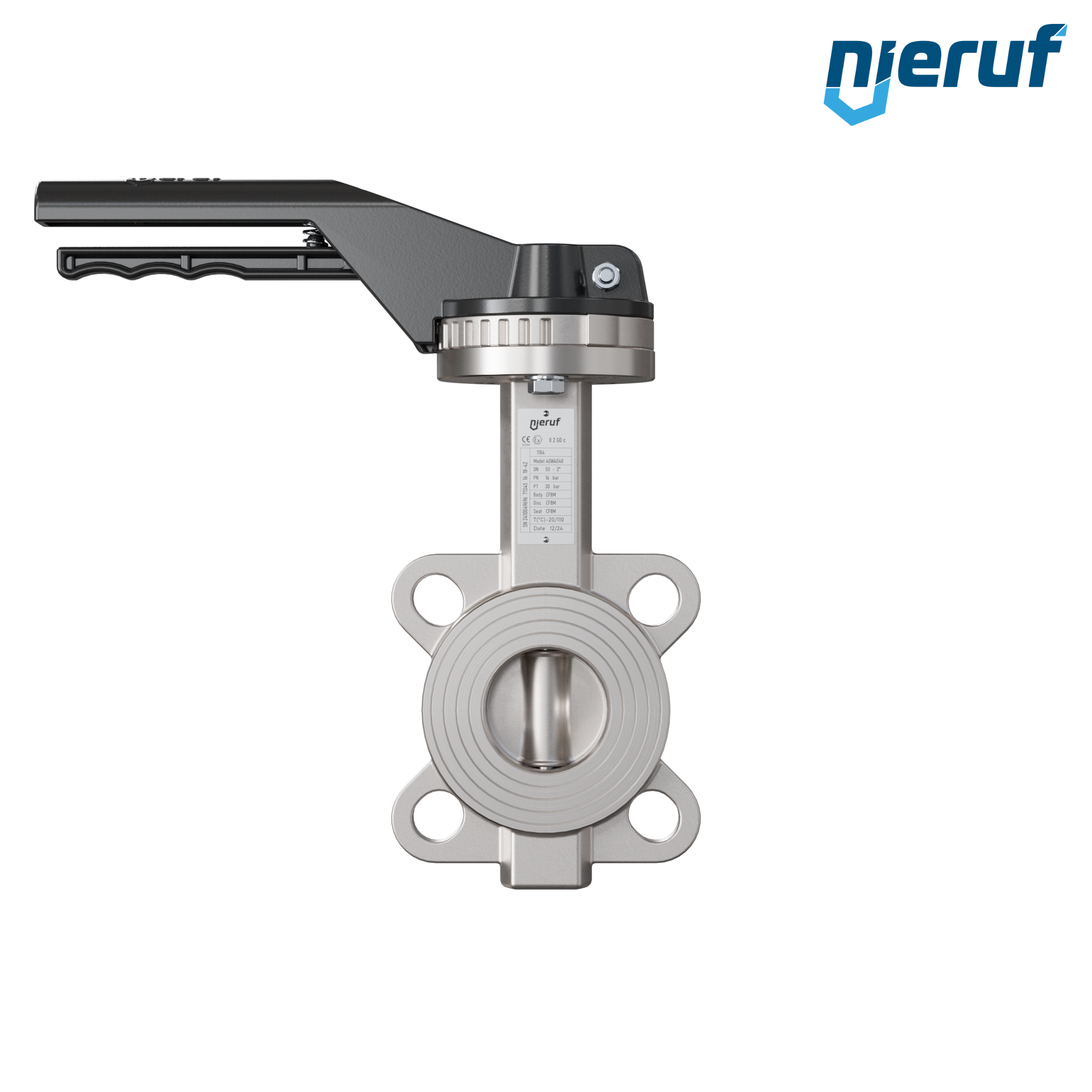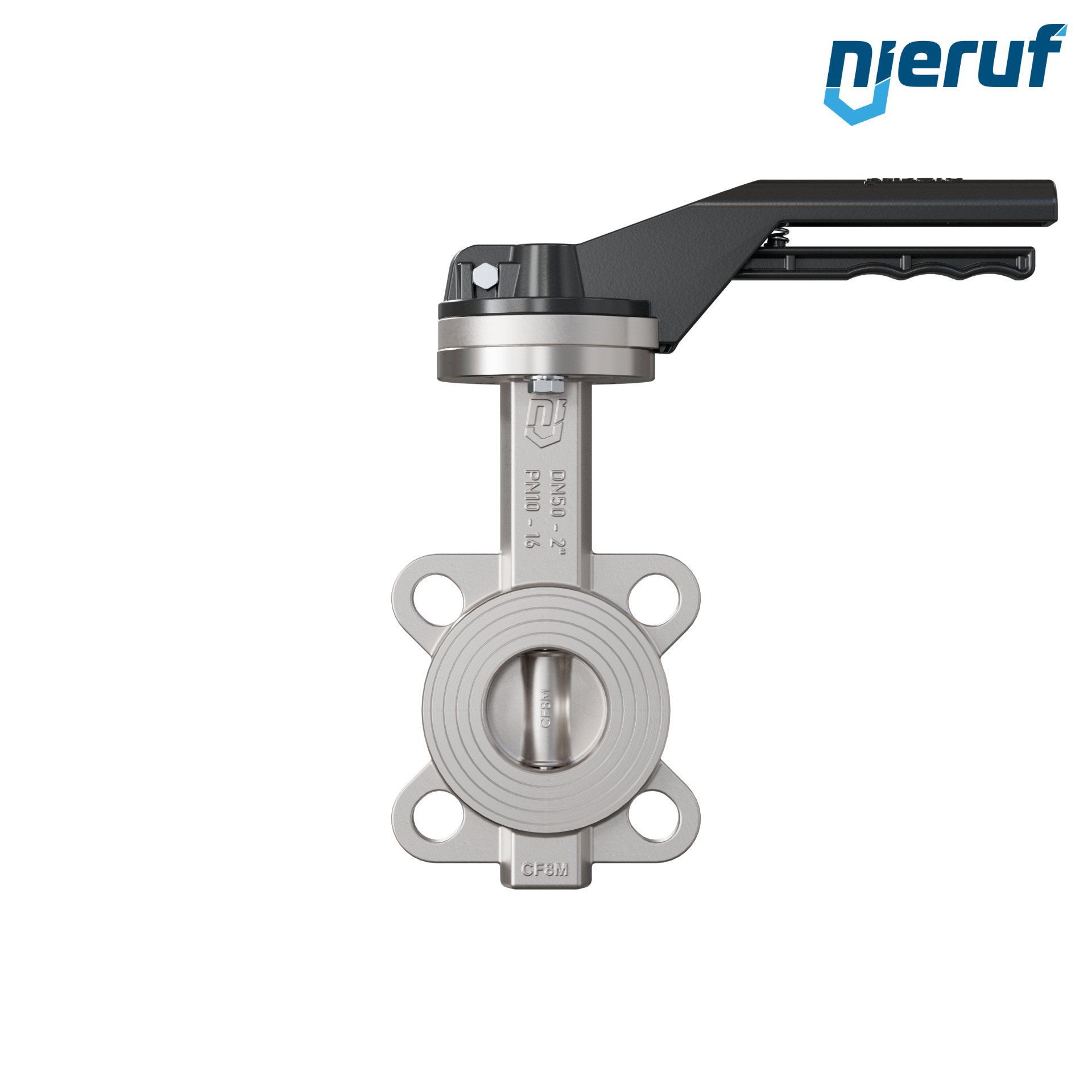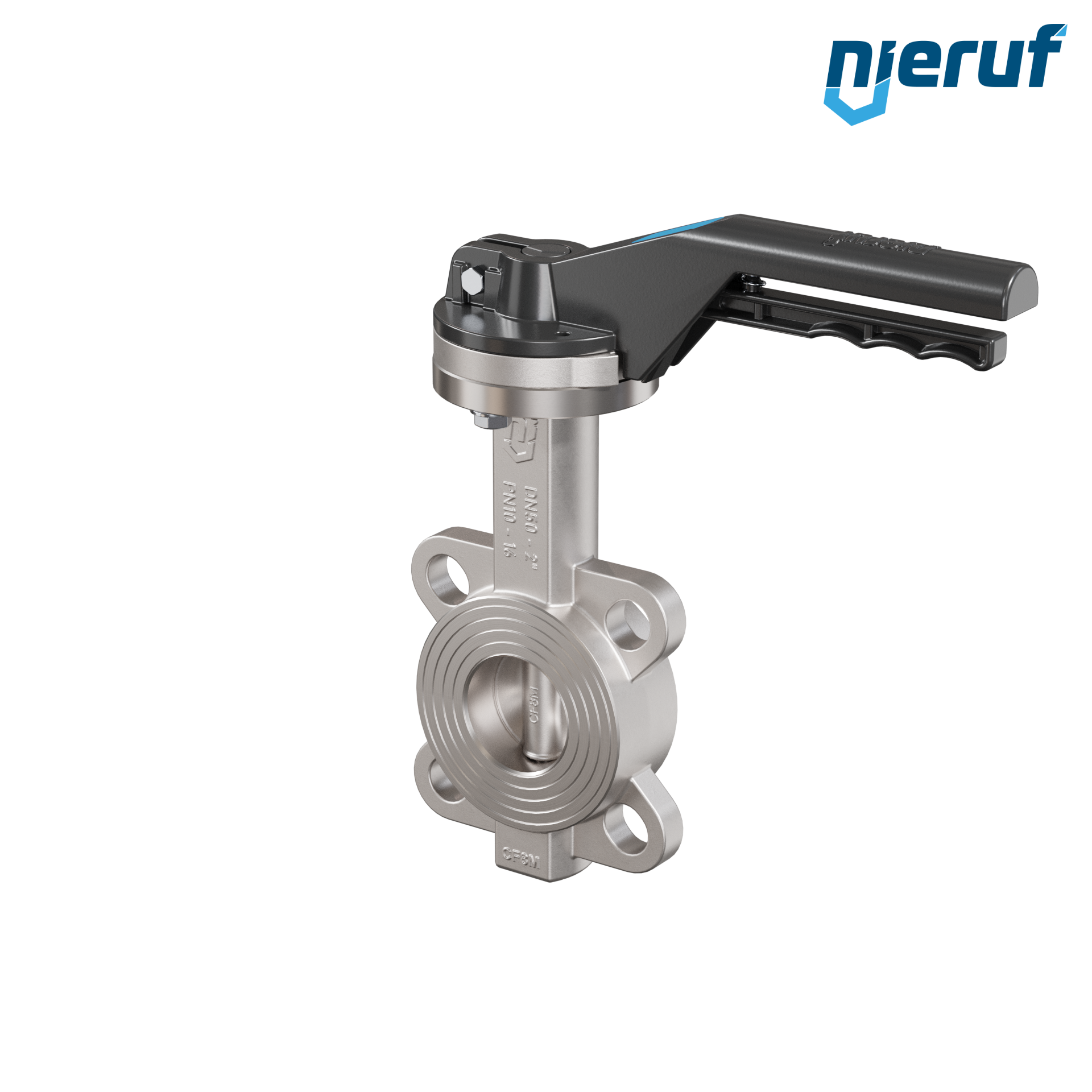 Edelstahl-Absperrklappe DN 50 PN16 mit Zentrieraugen Gehäuse aus Edelstahl 1.4408 Klappenscheibe aus Edelstahl 1.4408 mit Handhebel und Dichtung aus metall