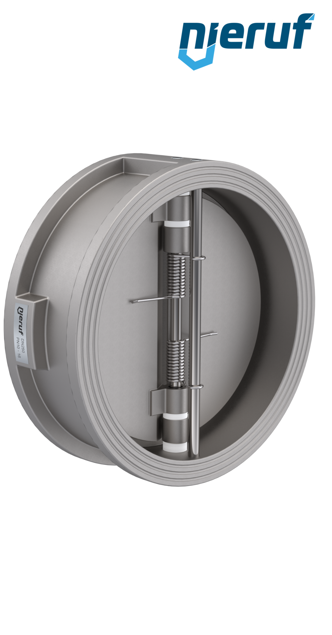 Doppelflügel-Rückschlagklappe DN250 Dichtung FKM (Viton) PN 10/16 DIN EN 1092-1 Form B, Gehäuse aus Edelstahl 1.4408, Flügel aus Edelstahl 1.4408