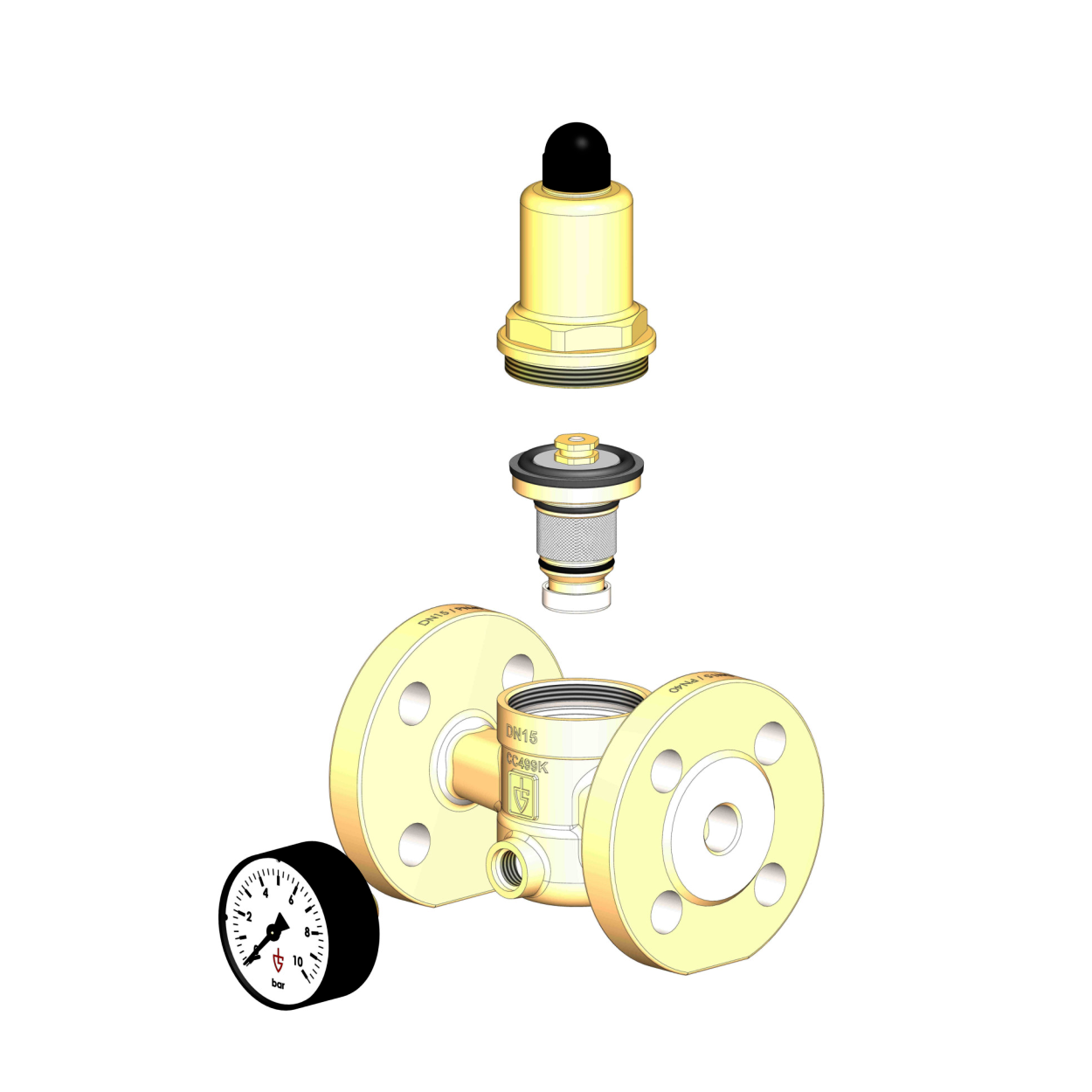 hochwertige, wärmebeständige Elastomer-Formmembrane mit Gewebeeinlage. Druckverstellung über nicht- steigende Spindel.