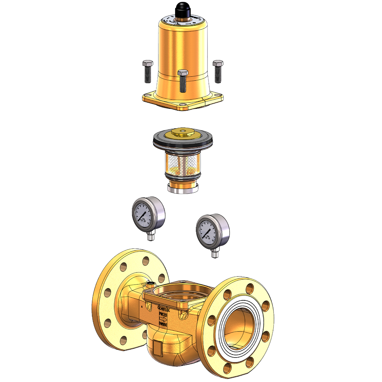 hochwertige, wärmebeständige Elastomer-Formmembrane mit Gewebeeinlage. Druckverstellung über nicht- steigende Spindel.