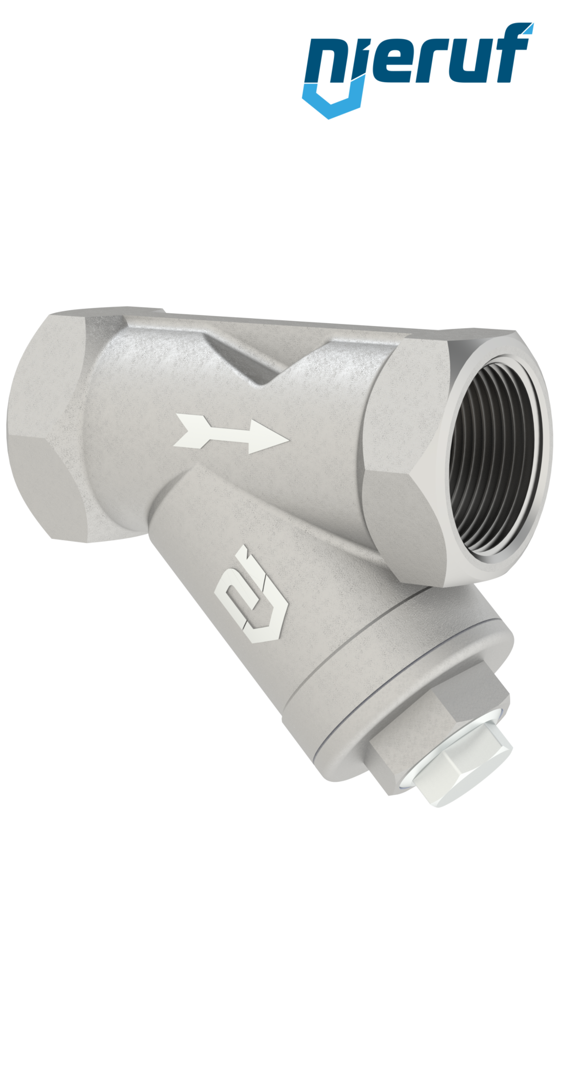 Gewinde-Schmutzfänger aus Edelstahl in Y-Bauart mit Verschlusstopfen und herausnehmbarem Edelstahlfilter, horizontaler oder vertikaler Einbau.