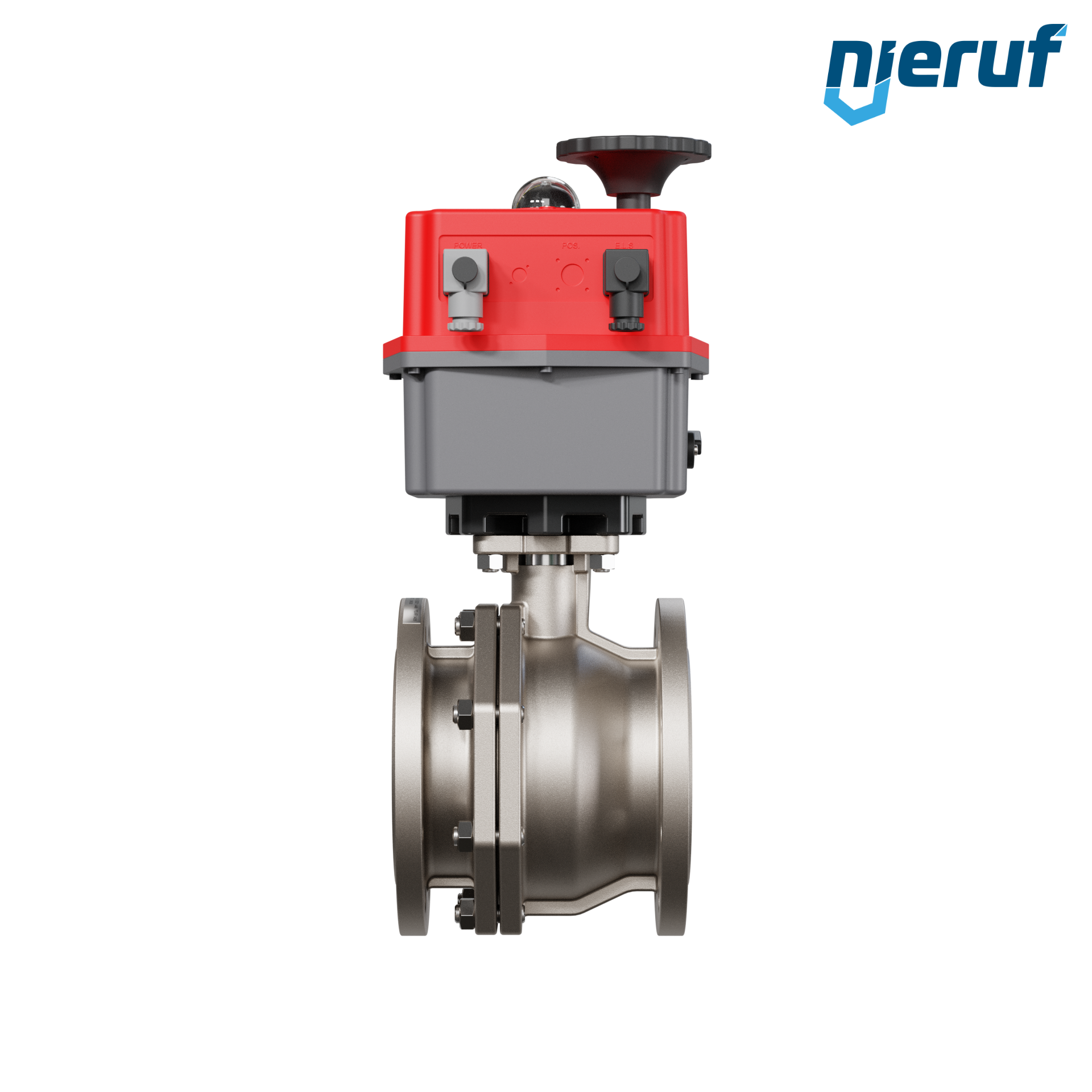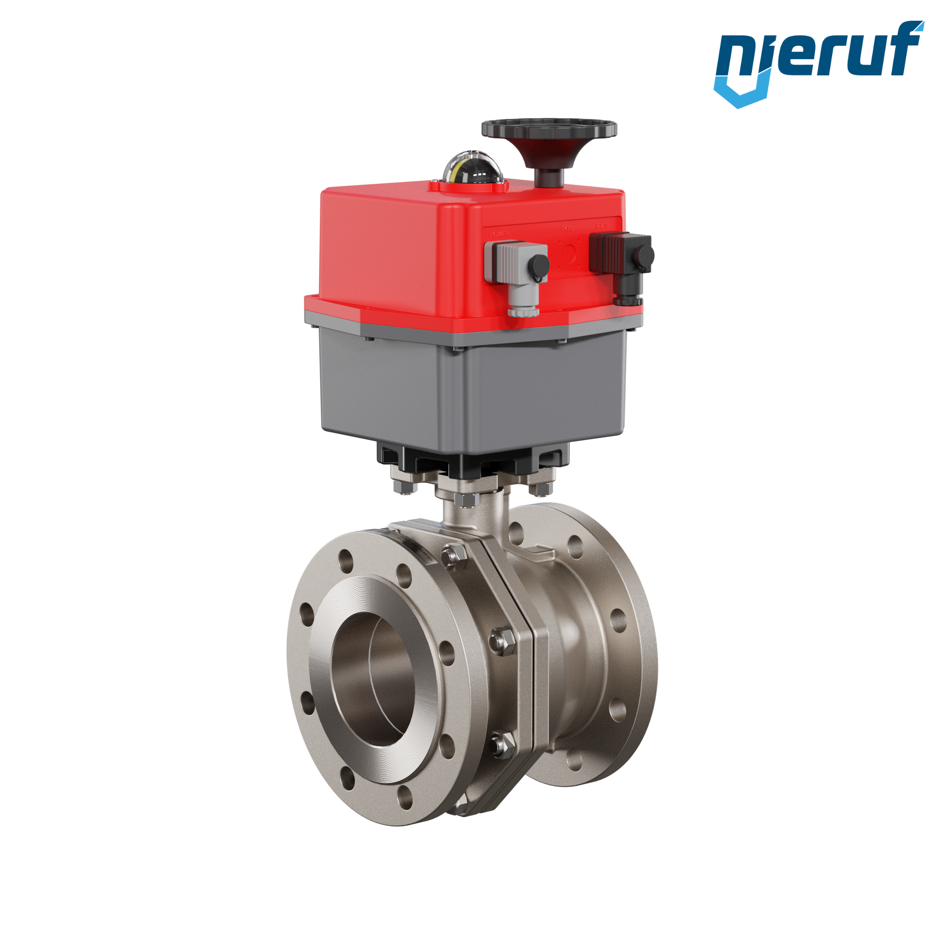 Dieser hoch qualitative Automatik-Flanschkugelhahn aus Edelstahl mit elektronischem Drehantrieb (Serie S = multivoltage 24-240V AC/DC) hat eine optische Stellungsanzeige und eine Handnotbetätigung.