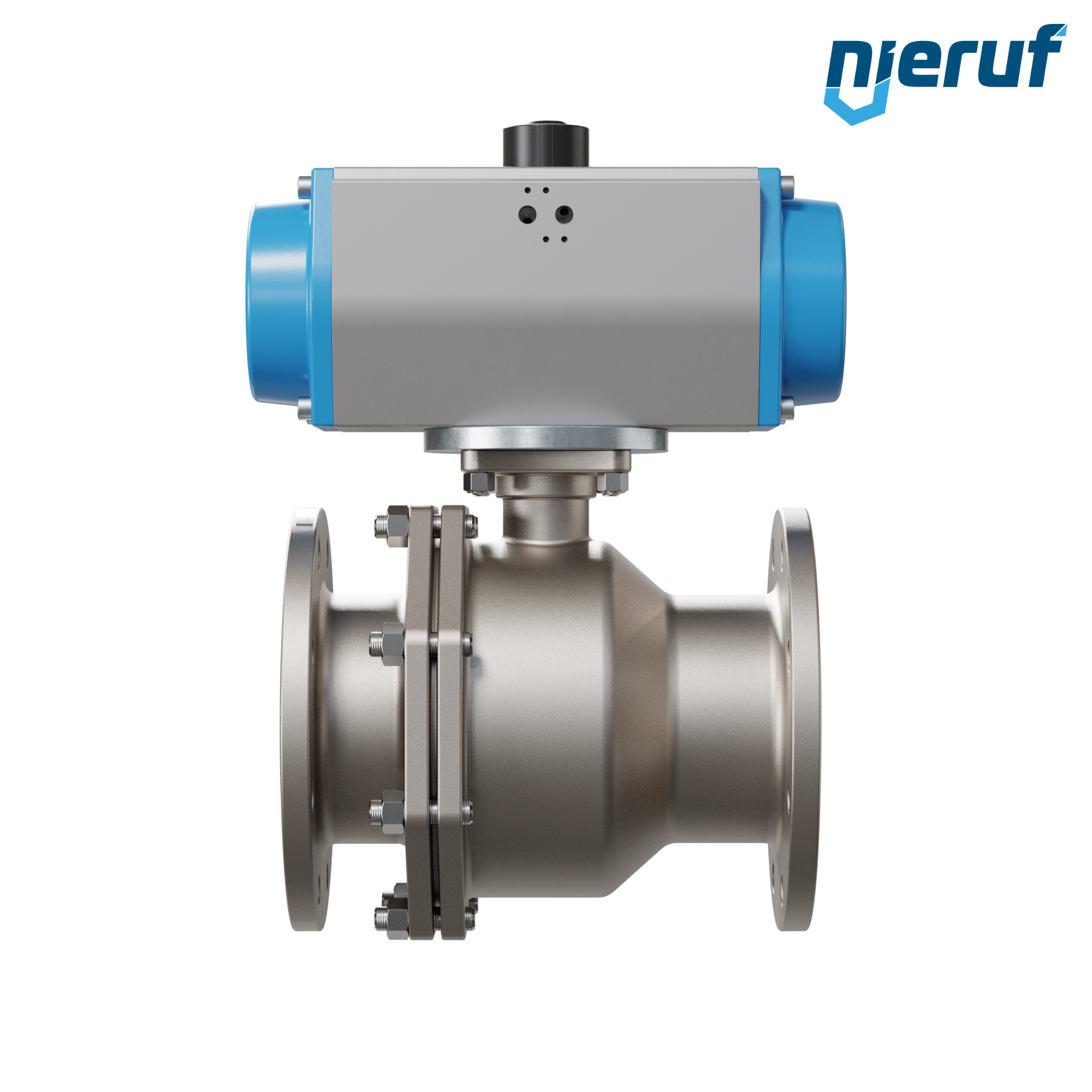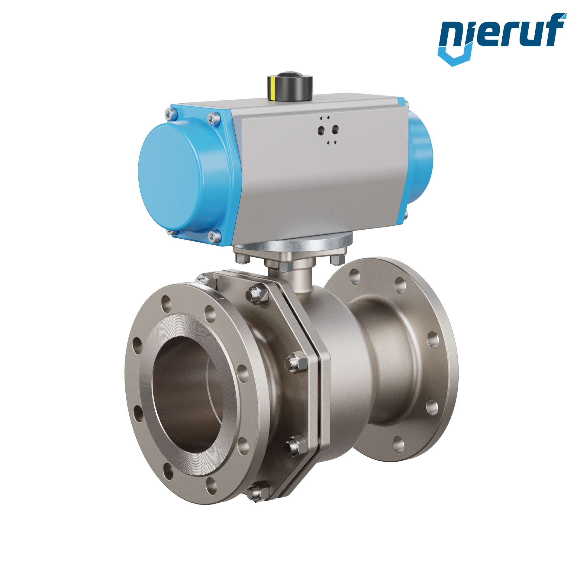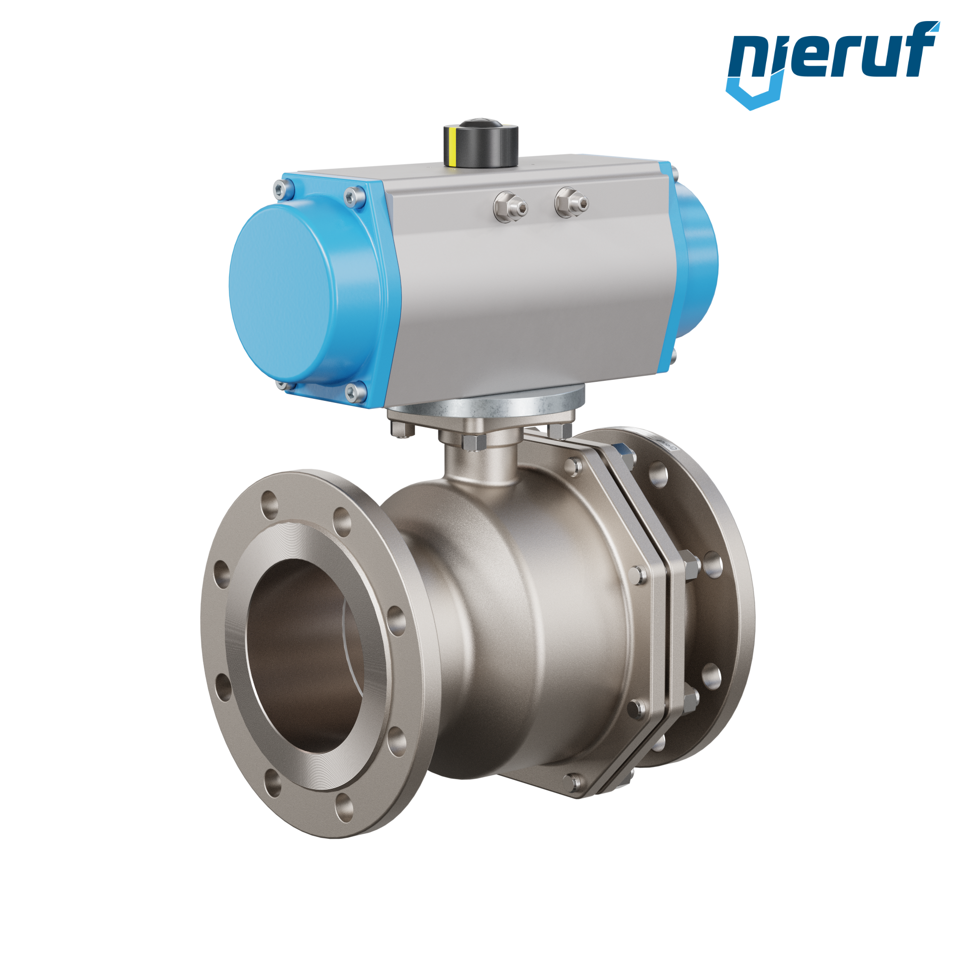 Für diesen hoch qualitativen Automatik-Flanschkugelhahn aus Edelstahl mit pneumatischem Drehantrieb (GD = doppeltwirkend) ist keine Brücke und kein Mitnehmer notwendig. Der Antrieb wird direkt auf den Kugelhahn aufgesetzt.