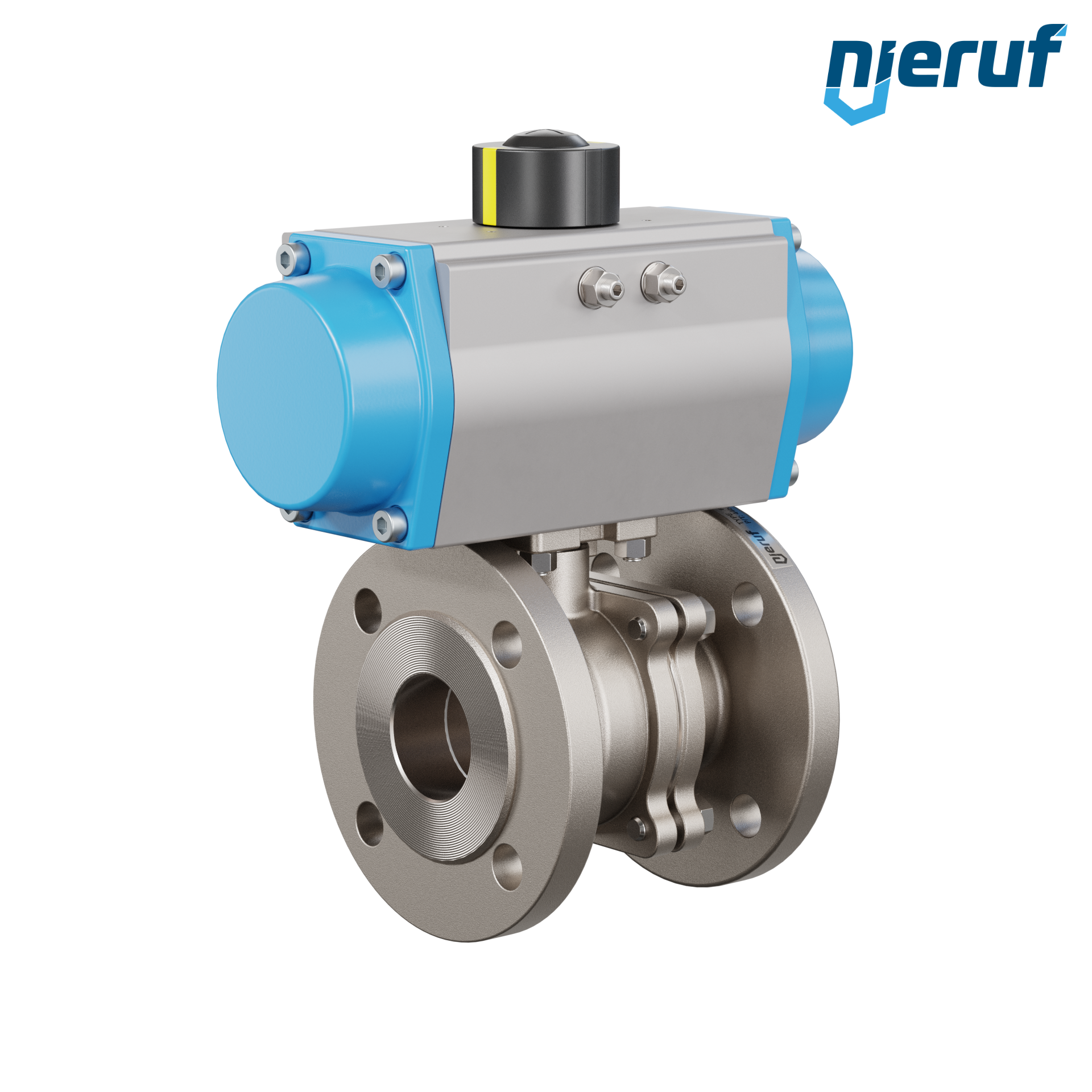 Für diesen hoch qualitativen Automatik-Muffenkugelhahn aus Edelstahl mit pneumatischem Drehantrieb (GS = einfachwirkend) ist keine Brücke und kein Mitnehmer notwendig.