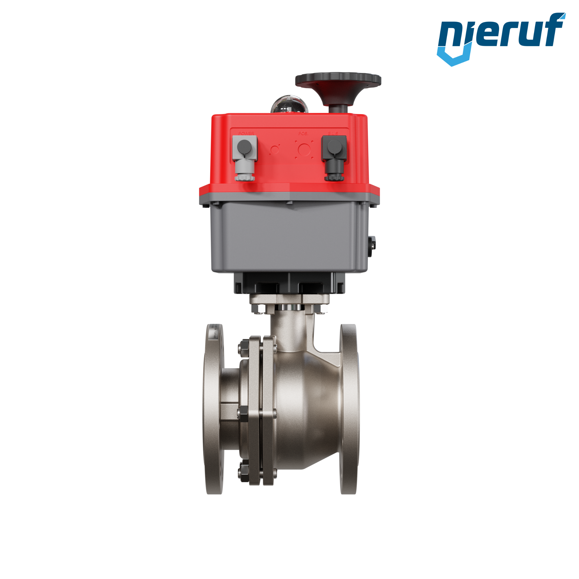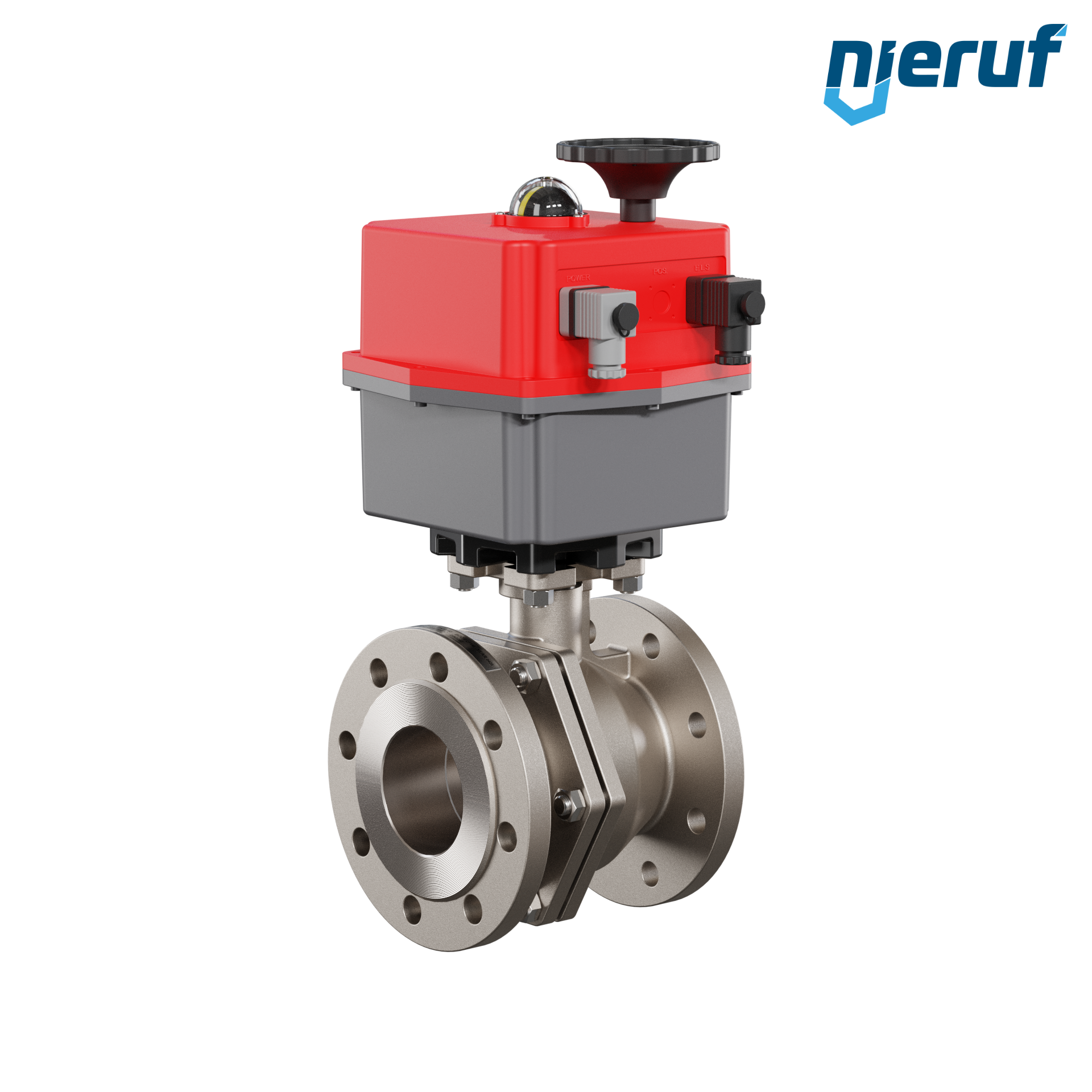 Dieser hoch qualitative Automatik-Flanschkugelhahn aus Edelstahl mit elektronischem Drehantrieb (Serie S = multivoltage 24-240V AC/DC) hat eine optische Stellungsanzeige und eine Handnotbetätigung.