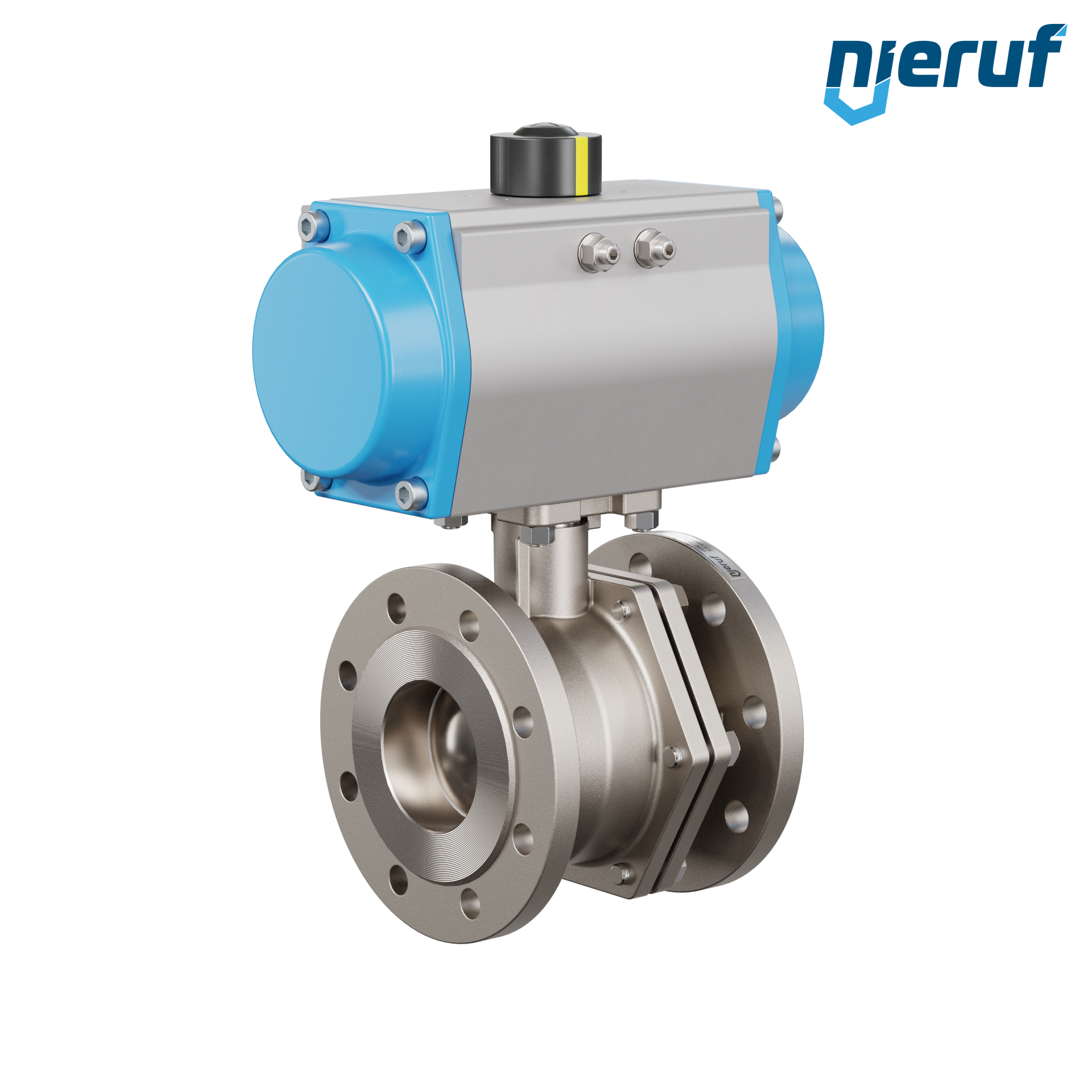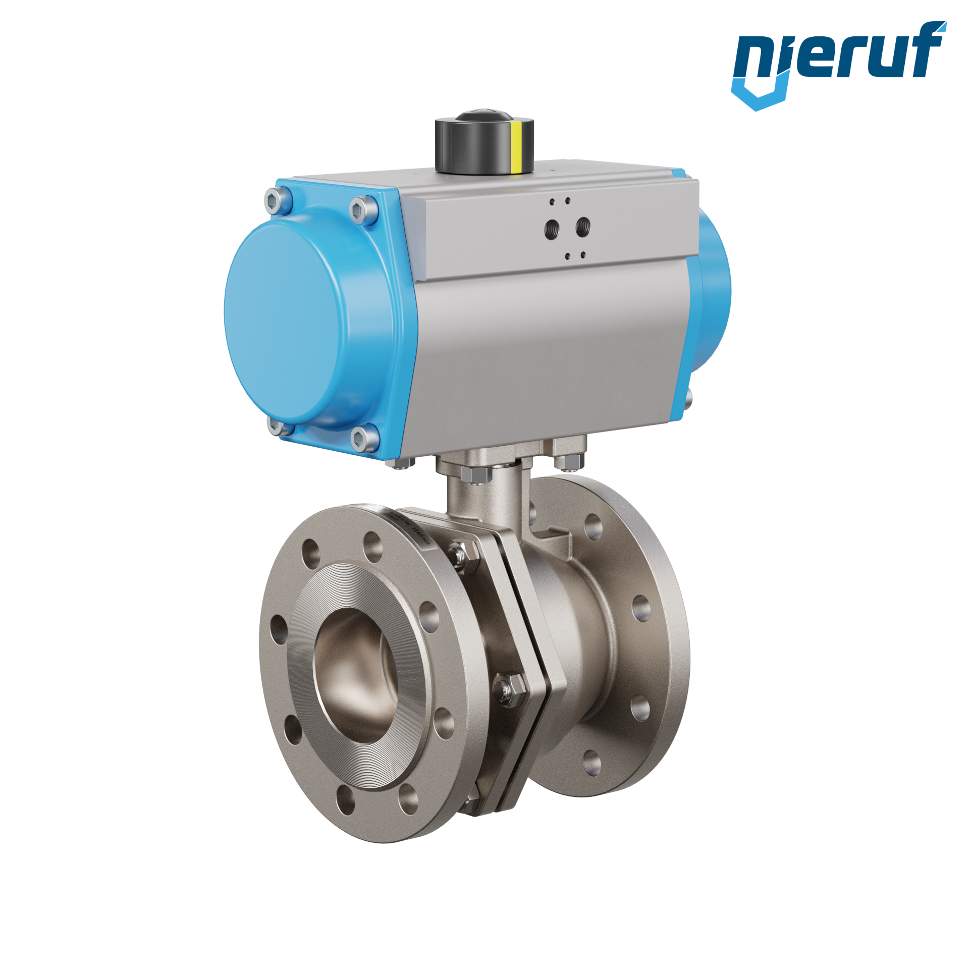 Für diesen hoch qualitativen Automatik-Muffenkugelhahn aus Edelstahl mit pneumatischem Drehantrieb (GS = einfachwirkend) ist keine Brücke und kein Mitnehmer notwendig.