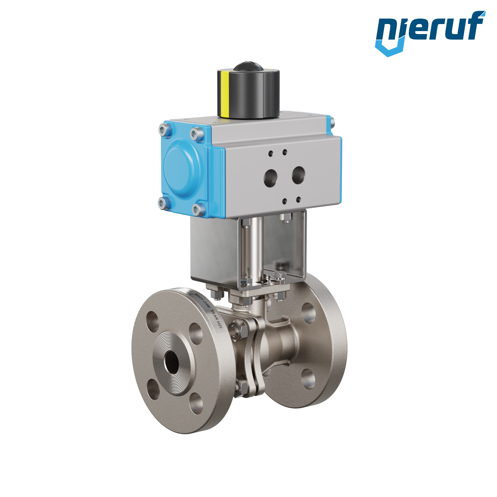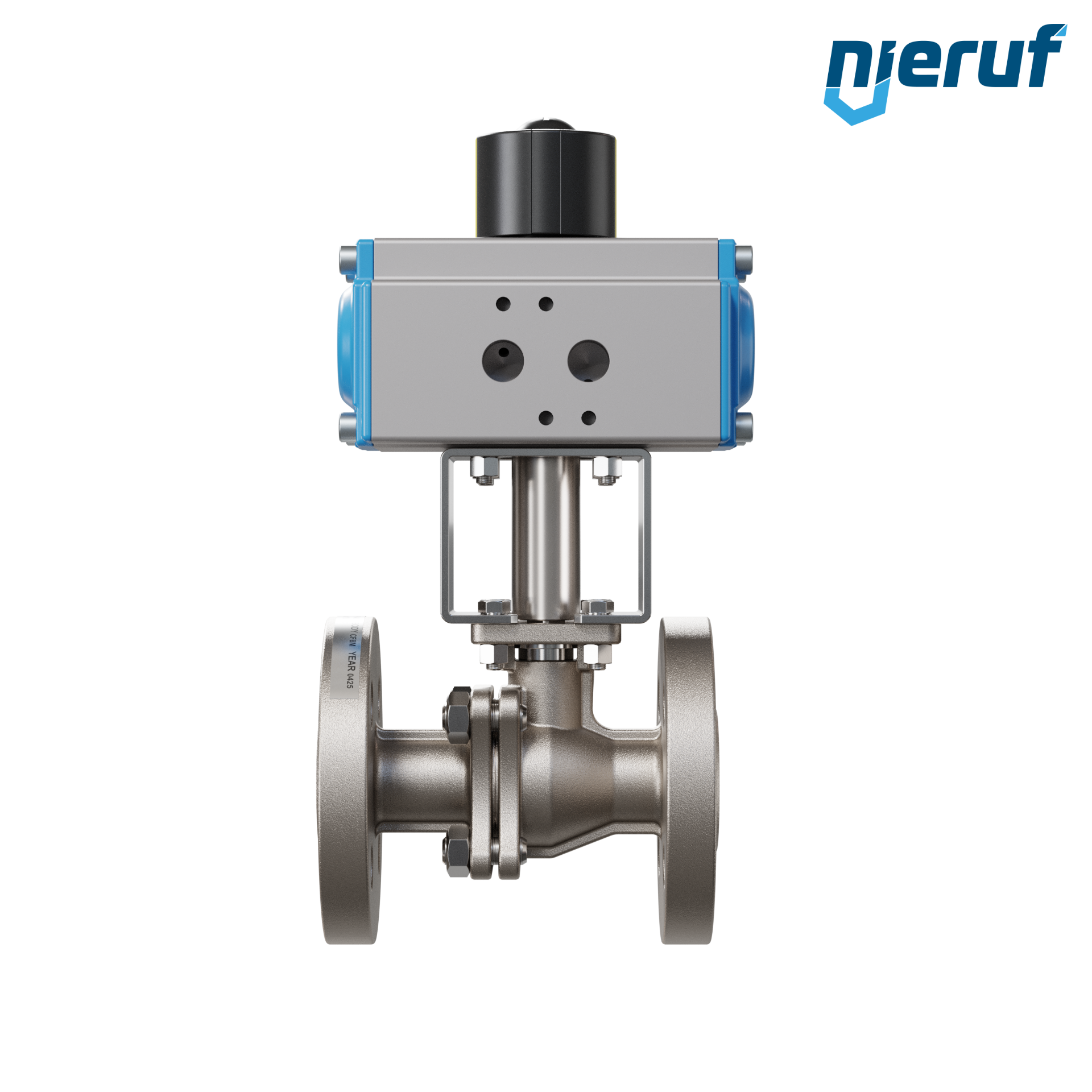 Für diesen hoch qualitativen Automatik-Flanschkugelhahn aus Edelstahl mit pneumatischem Drehantrieb (GD = doppeltwirkend) ist keine Brücke und kein Mitnehmer notwendig. Der Antrieb wird direkt auf den Kugelhahn aufgesetzt.
