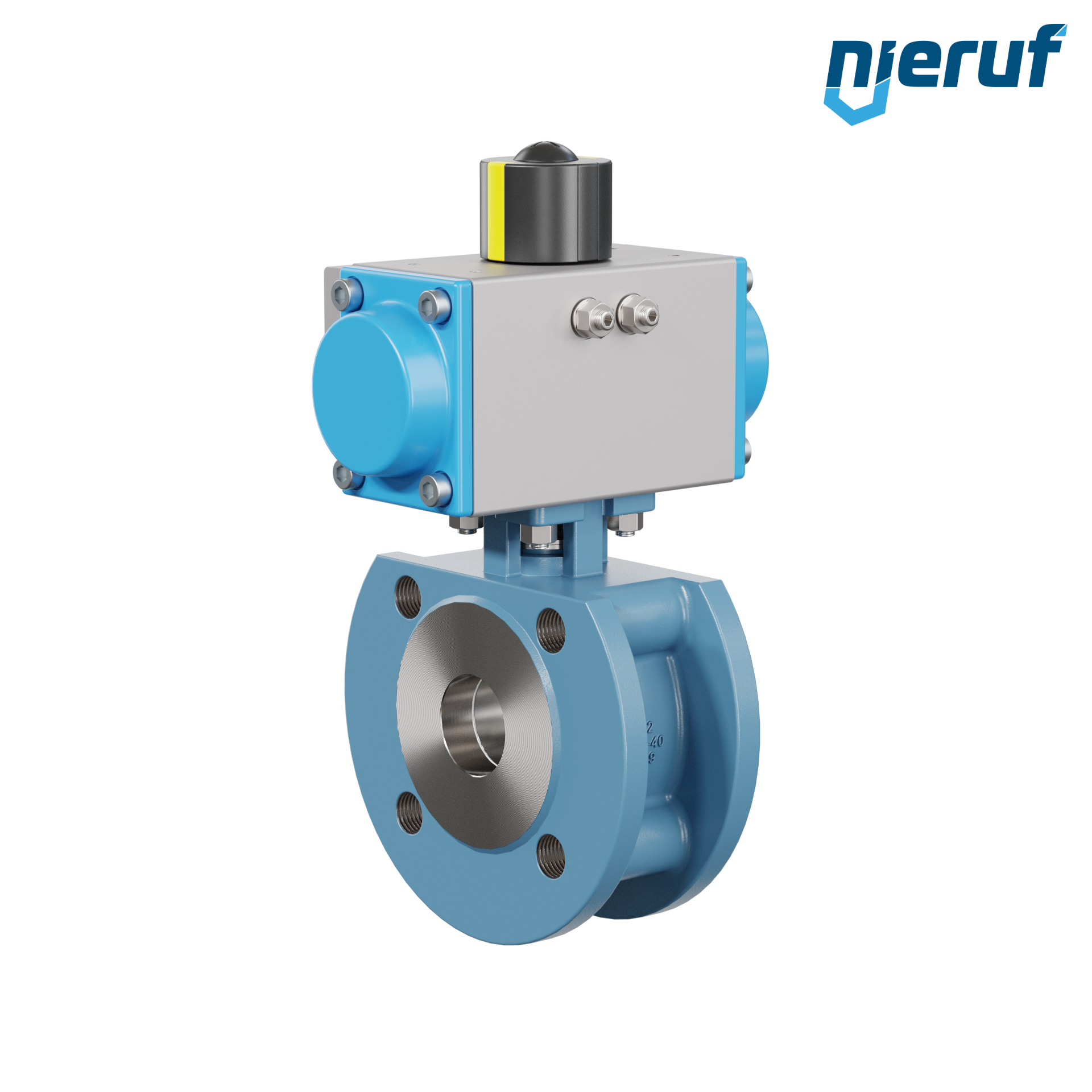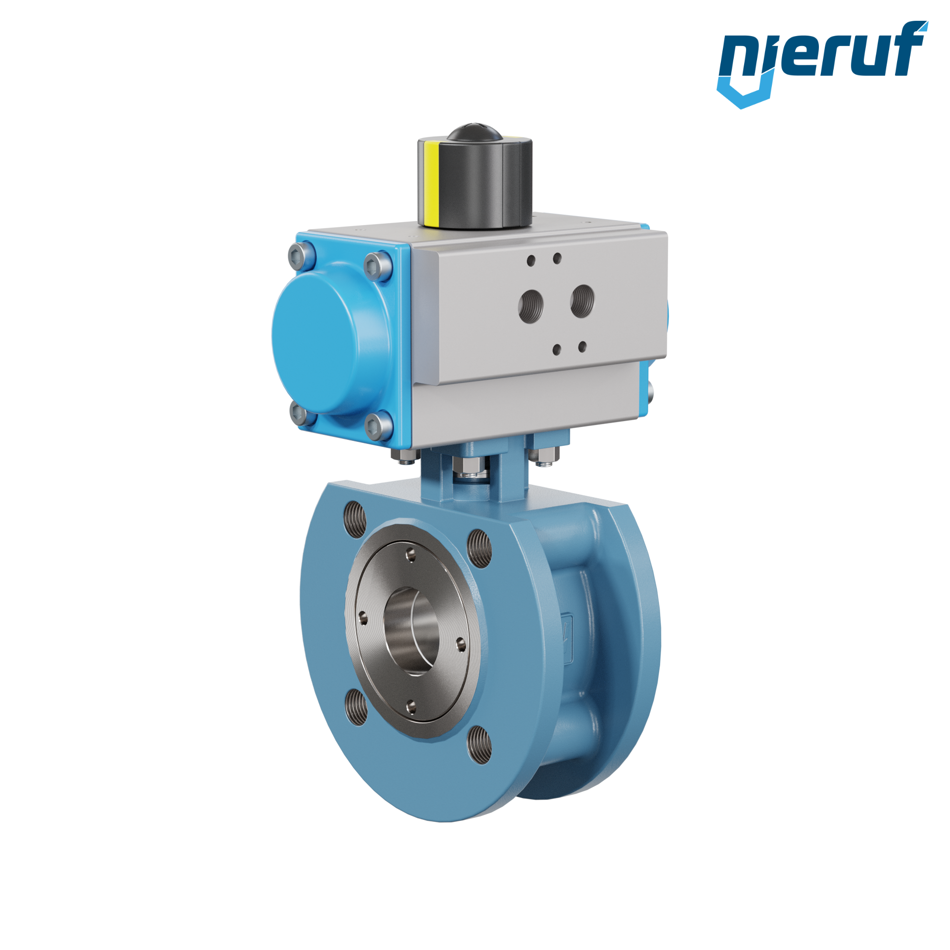 Für diesen hoch qualitativen Automatik-Flanschkugelhahn aus Stahlguss mit pneumatischem Drehantrieb (GD = doppeltwirkend) ist eine direkte Anflanschung von Magnetventilen nach Namur möglich.