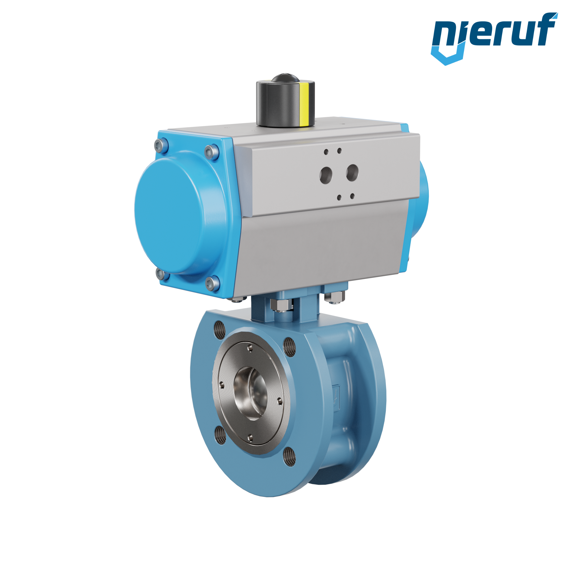 Für diesen hoch qualitativen Automatik-Flanschkugelhahn aus Stahlguss mit pneumatischem Drehantrieb (GS = einfachwirkend) ist eine direkte Anflanschung von Magnetventilen nach Namur möglich.