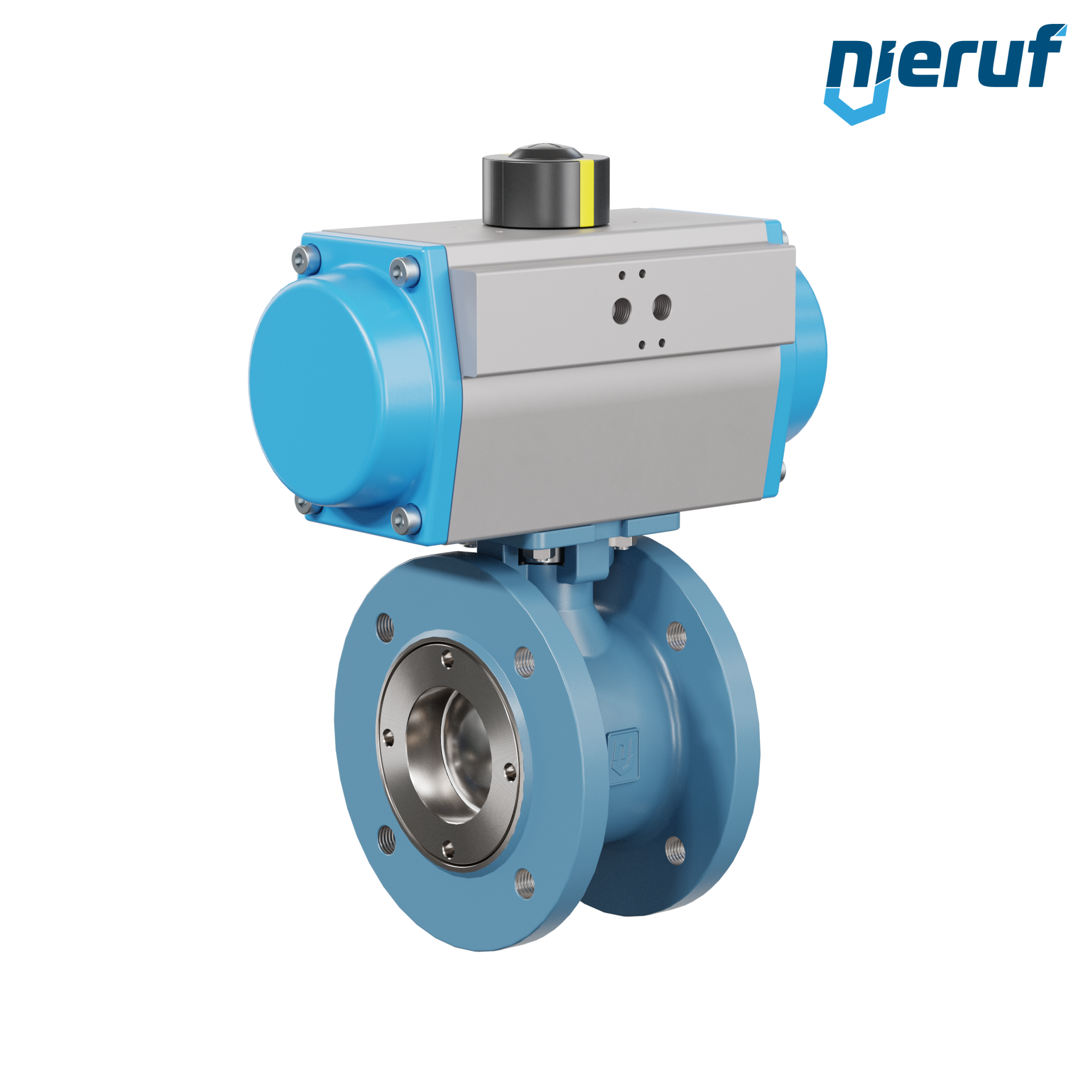 Für diesen hoch qualitativen Automatik-Flanschkugelhahn aus Stahlguss mit pneumatischem Drehantrieb (GS = einfachwirkend) ist eine direkte Anflanschung von Magnetventilen nach Namur möglich.
