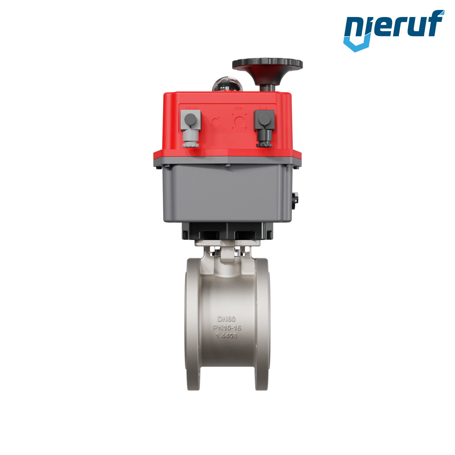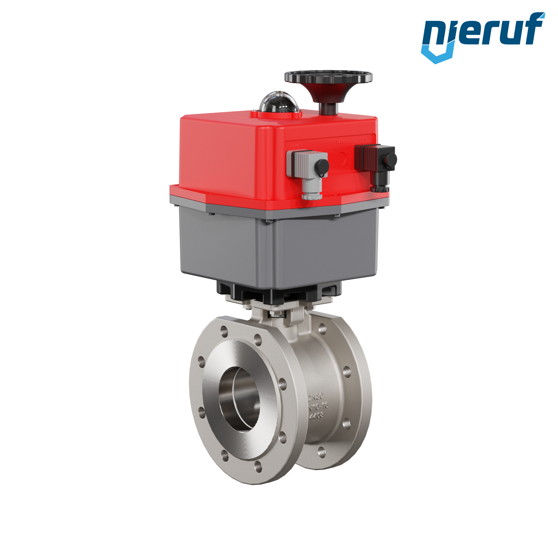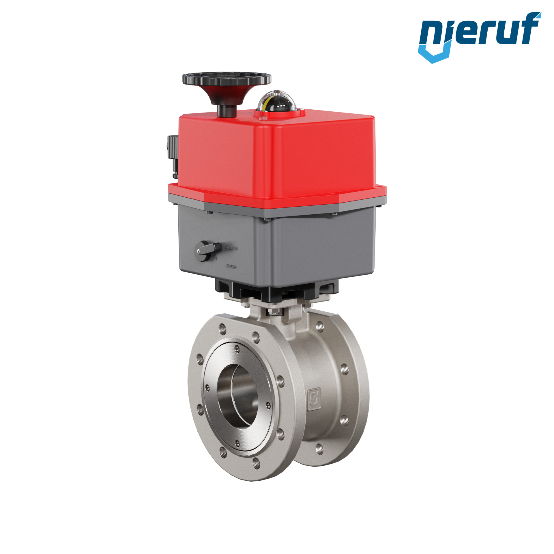 Dieser hoch qualitative Automatik-Kompaktflanschkugelhahn aus Edelstahl mit elektronischem Drehantrieb (Serie S = multi voltage) hat eine optische Stellungsanzeige und eine Handnotbetätigung.