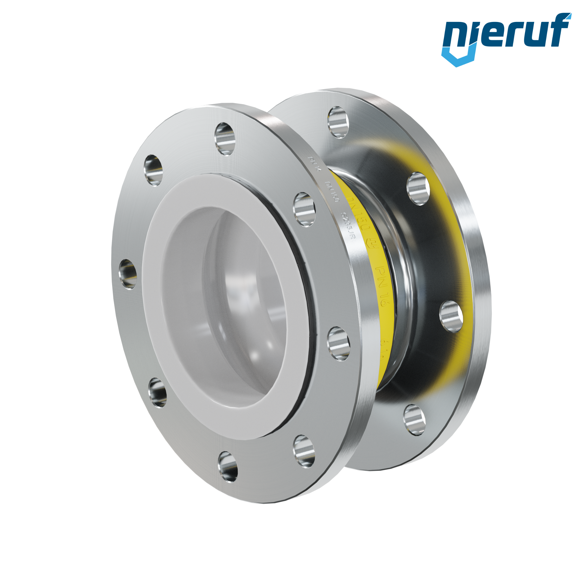 Dieser hochwertige Gummikompensator mit NBR Dichtung und Stahlflanschen besitzt eine FDA-Zulassung. Zusätzlich ist dieser Kompensator mit einer PTFE Auskleidung versehen, sodass dieser Kompensator durch die glatte Innenfläche eine hohe chemische Beständigkeit aufweist.