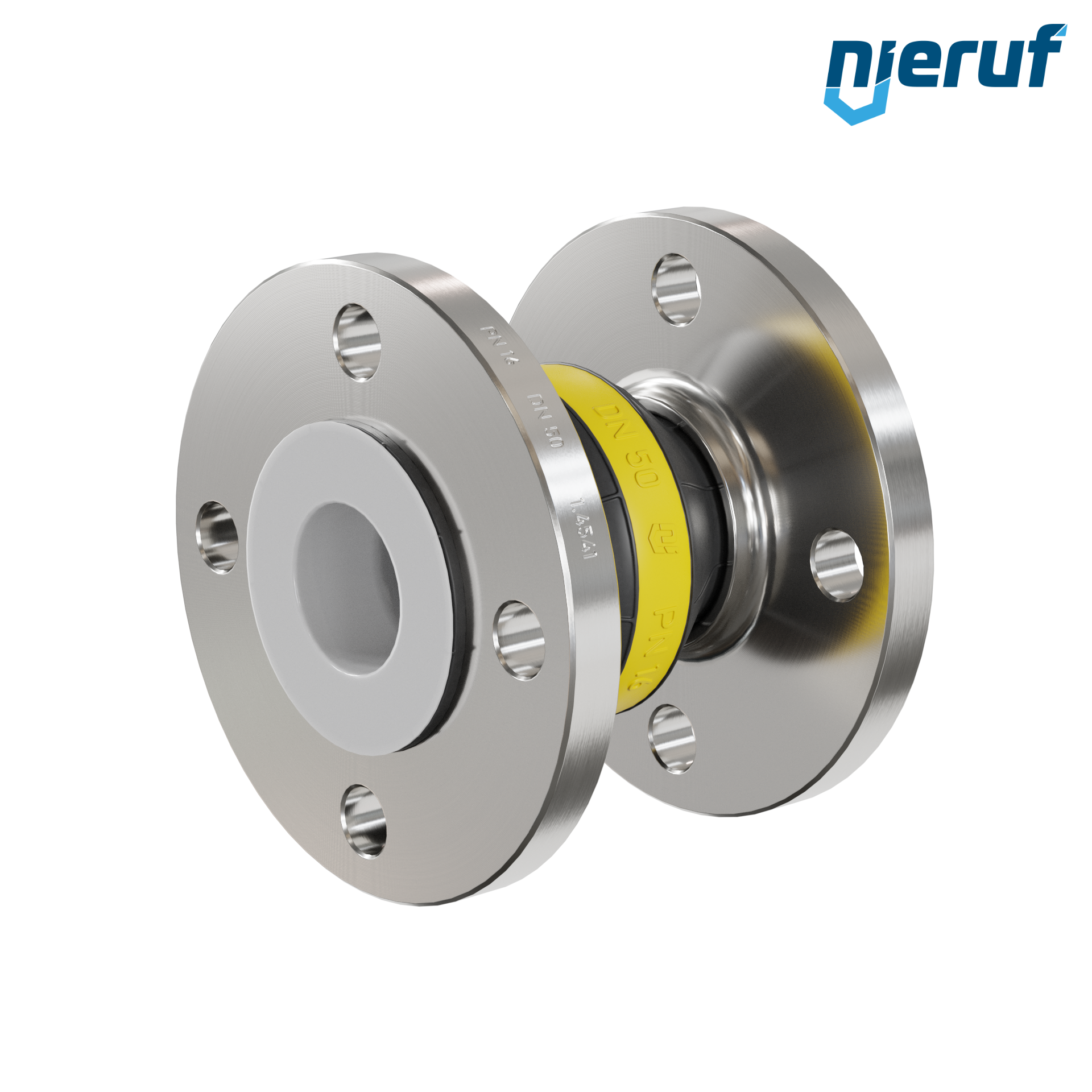 Dieser hochwertige Gummikompensator mit NBR Dichtung und Edelstahlflanschen besitzt eine FDA-Zulassung. Zusätzlich ist dieser Kompensator mit einer PTFE Auskleidung versehen, sodass dieser Kompensator durch die glatte Innenfläche eine hohe chemische Beständigkeit aufweist.