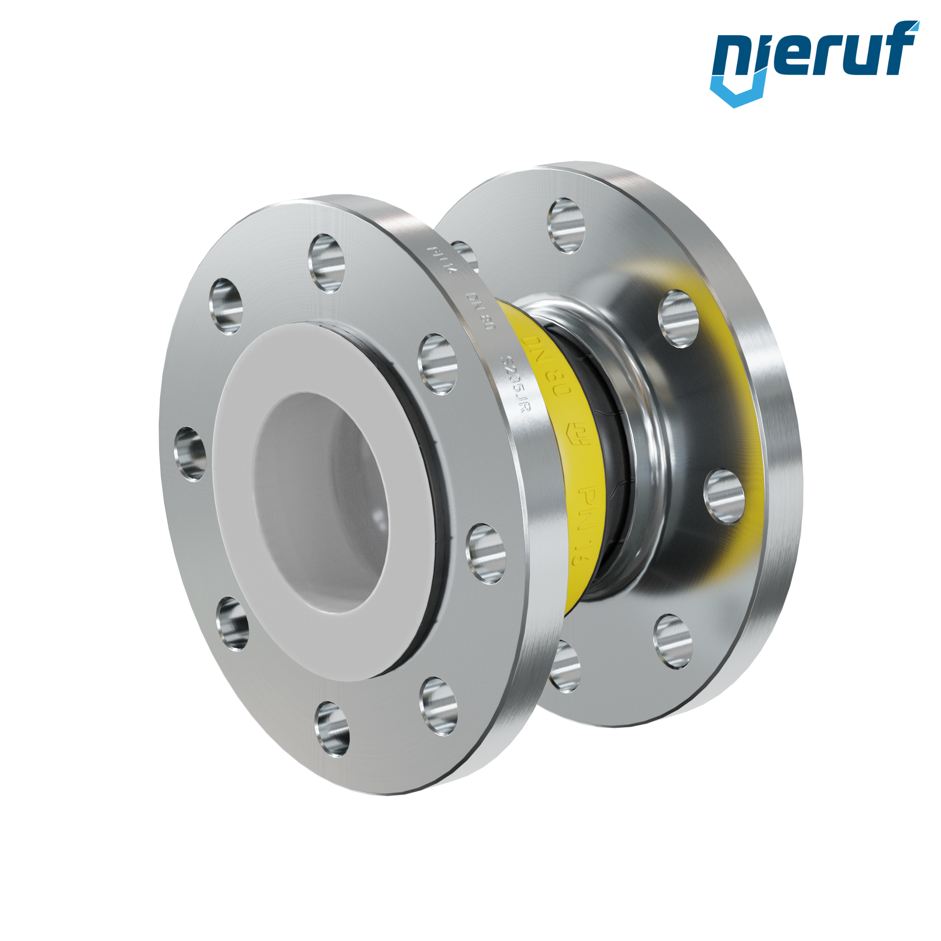 Dieser hochwertige Gummikompensator mit NBR Dichtung und Stahlflanschen besitzt eine FDA-Zulassung. Zusätzlich ist dieser Kompensator mit einer PTFE Auskleidung versehen, sodass dieser Kompensator durch die glatte Innenfläche eine hohe chemische Beständigkeit aufweist.