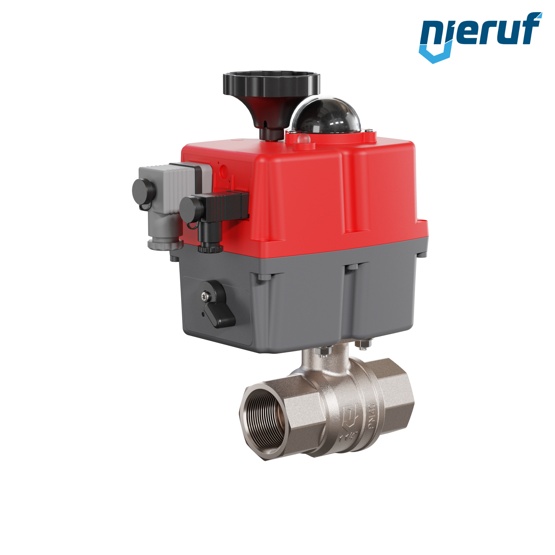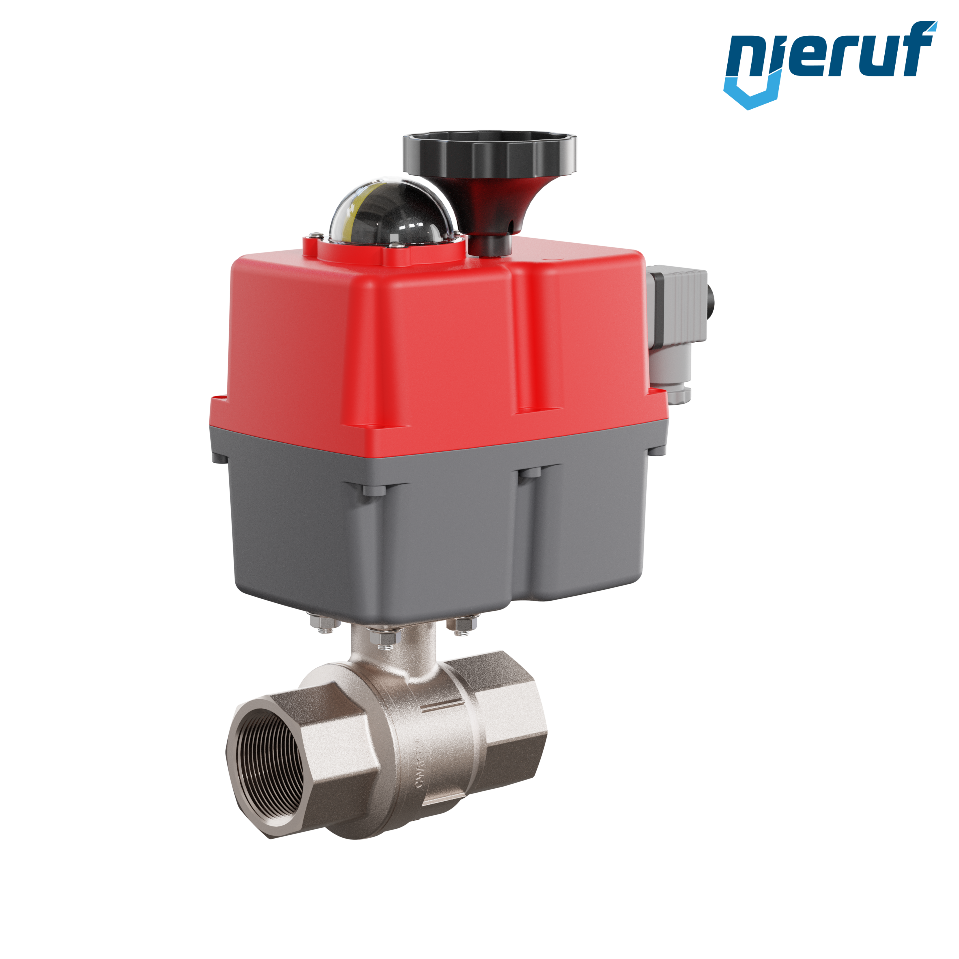 Dieser hoch qualitative Automatik-Muffenkugelhahn aus Messing mit elektronischem Drehantrieb (Serie S) hat eine optische Stellungsanzeige und eine Handnotbetätigung.
