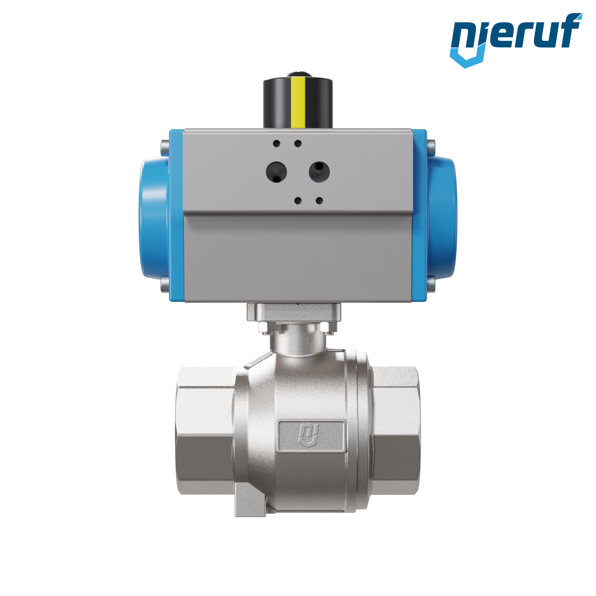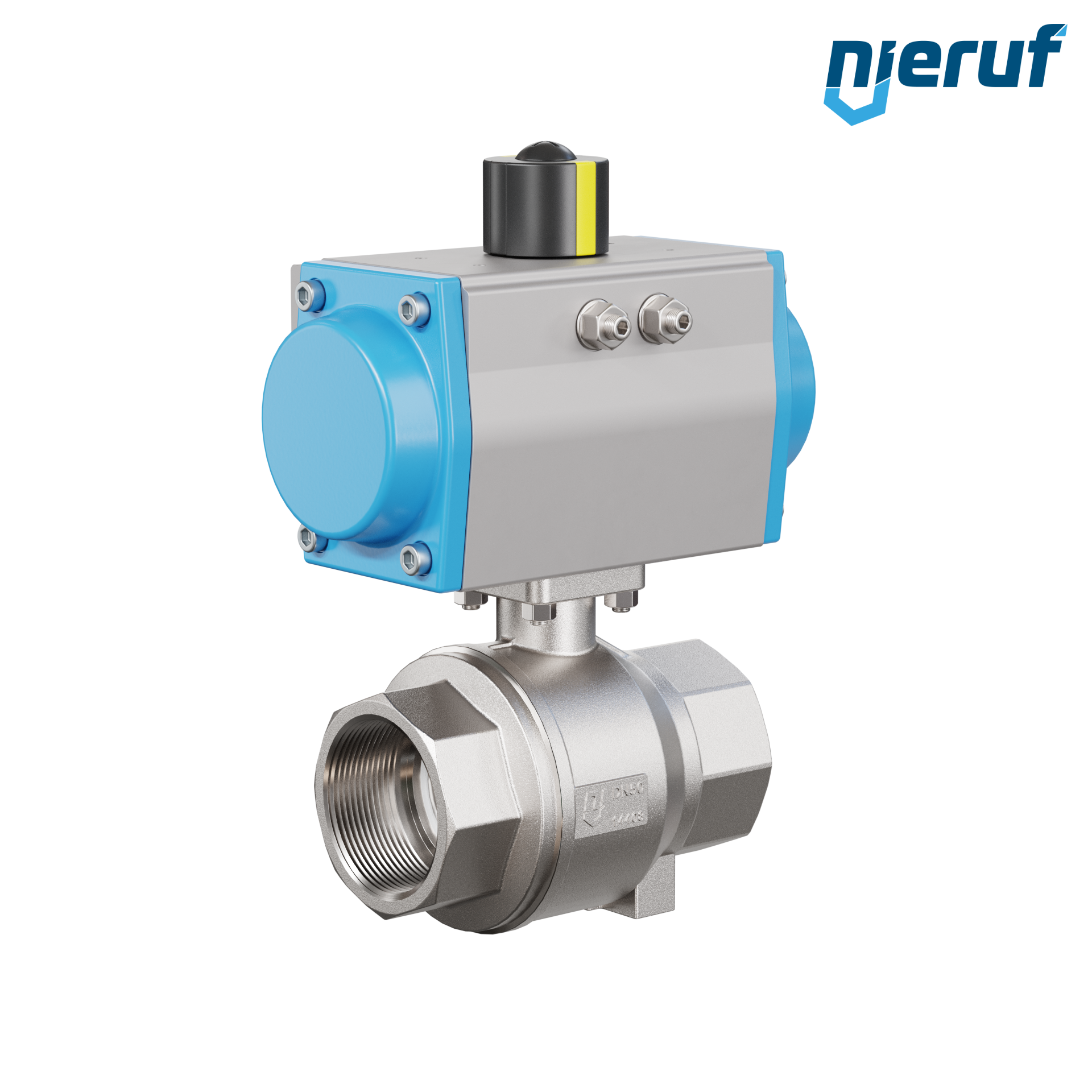 Für diesen hoch qualitativen Automatik-Muffenkugelhahn aus Edelstahl mit pneumatischem Drehantrieb (GS = einfachwirkend) ist keine Brücke und kein Mitnehmer notwendig. Der Antrieb wird direkt auf den Kugelhahn aufgesetzt. Steuermedium des Antriebs ist gefilterte Druckluft