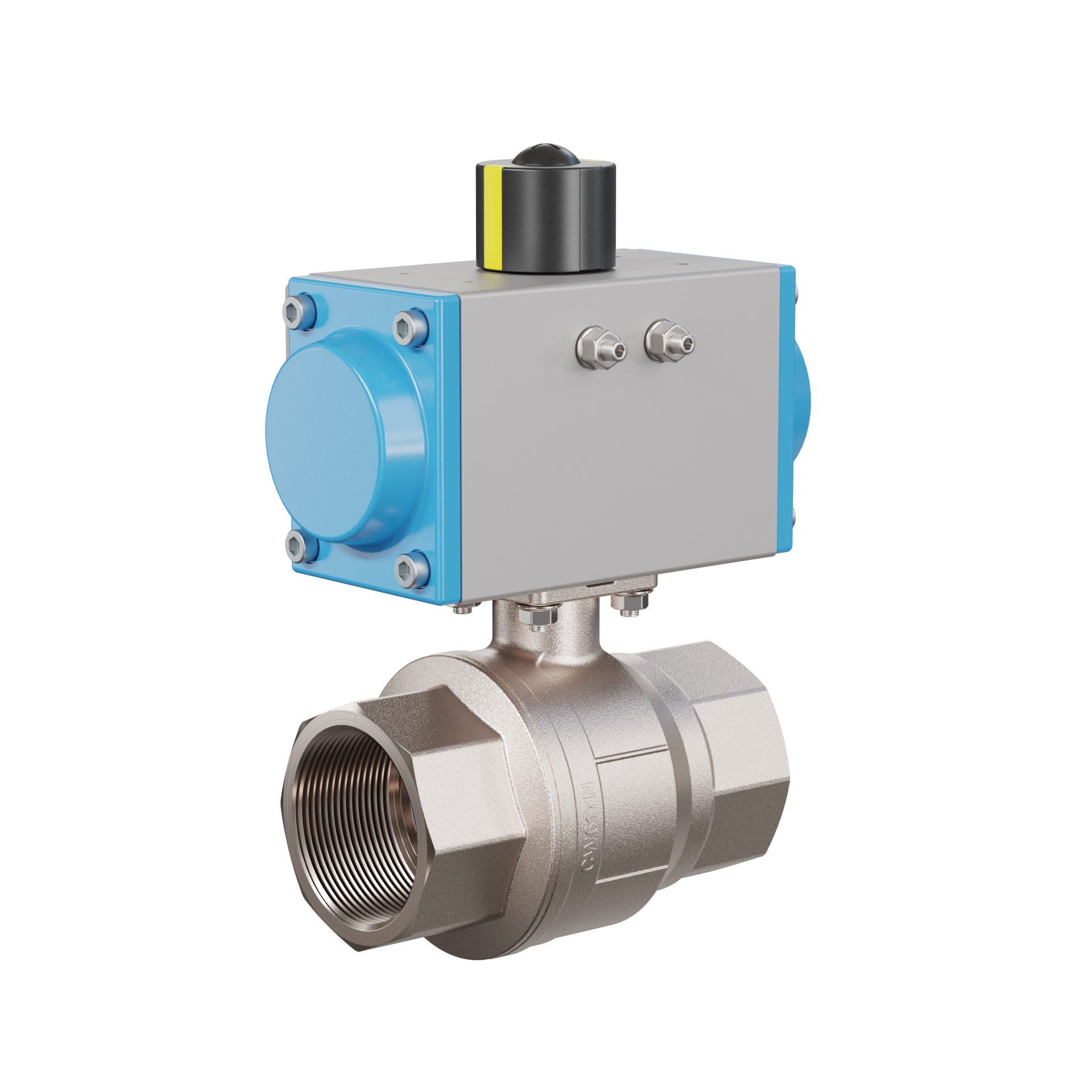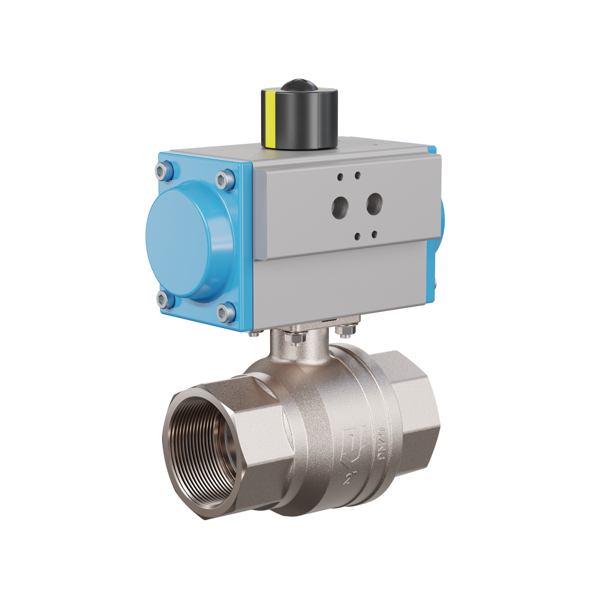 Automatik-Muffenkugelhahn DN50 - 2" Zoll Messing CW617N vernickelt PK01 pneumatischer Drehantrieb GD063 aus Aluminium (Wirkungsweise: GD = doppeltwirkend)