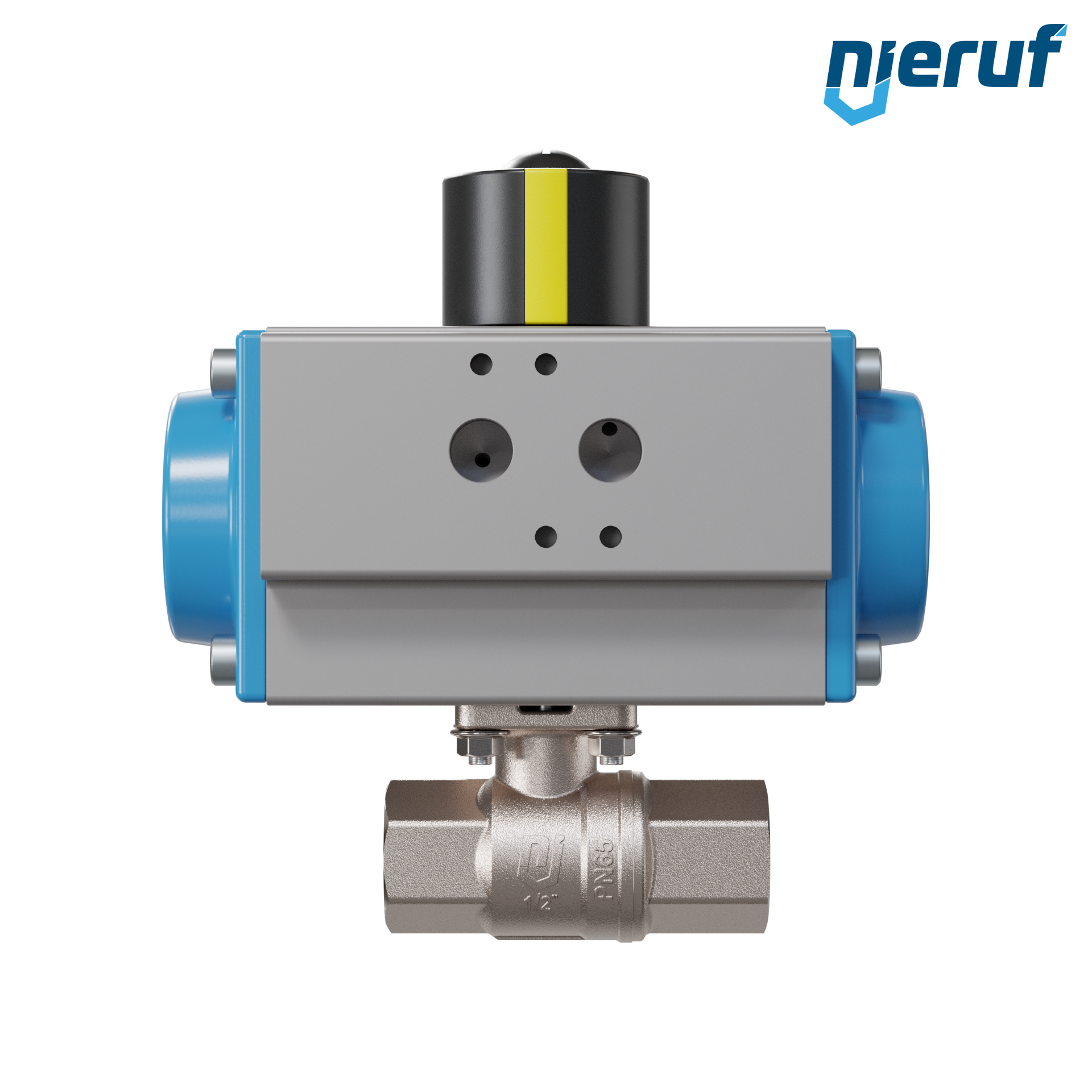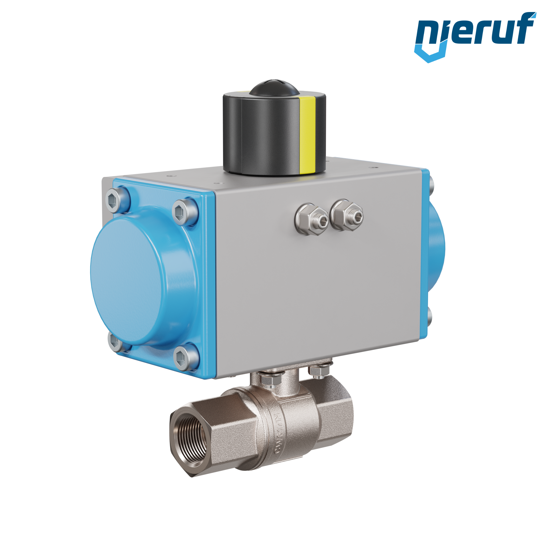 Automatik-Muffenkugelhahn DN15 - 1/2" Zoll Messing CW617N vernickelt PK01 pneumatischer Drehantrieb GS052 aus Aluminium (Wirkungsweise: GS = einfachwirkend)