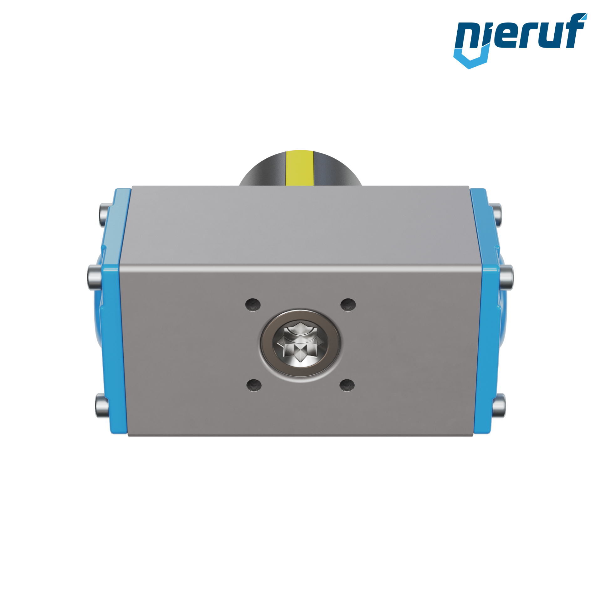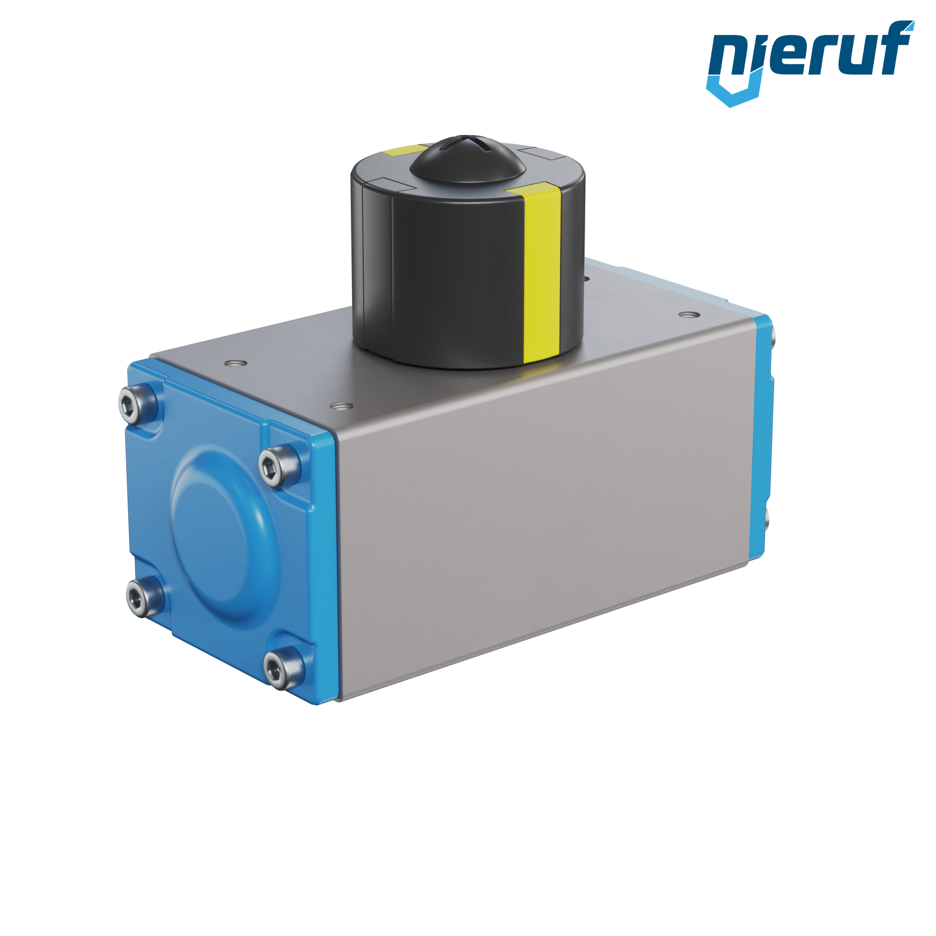 Kompakter, doppeltwirkender, pneumatischer Antrieb zum Steuern und Regeln von Armaturen. Voreingestellter Schwenkwinkel 90° mit optischer Stellungsanzeige.