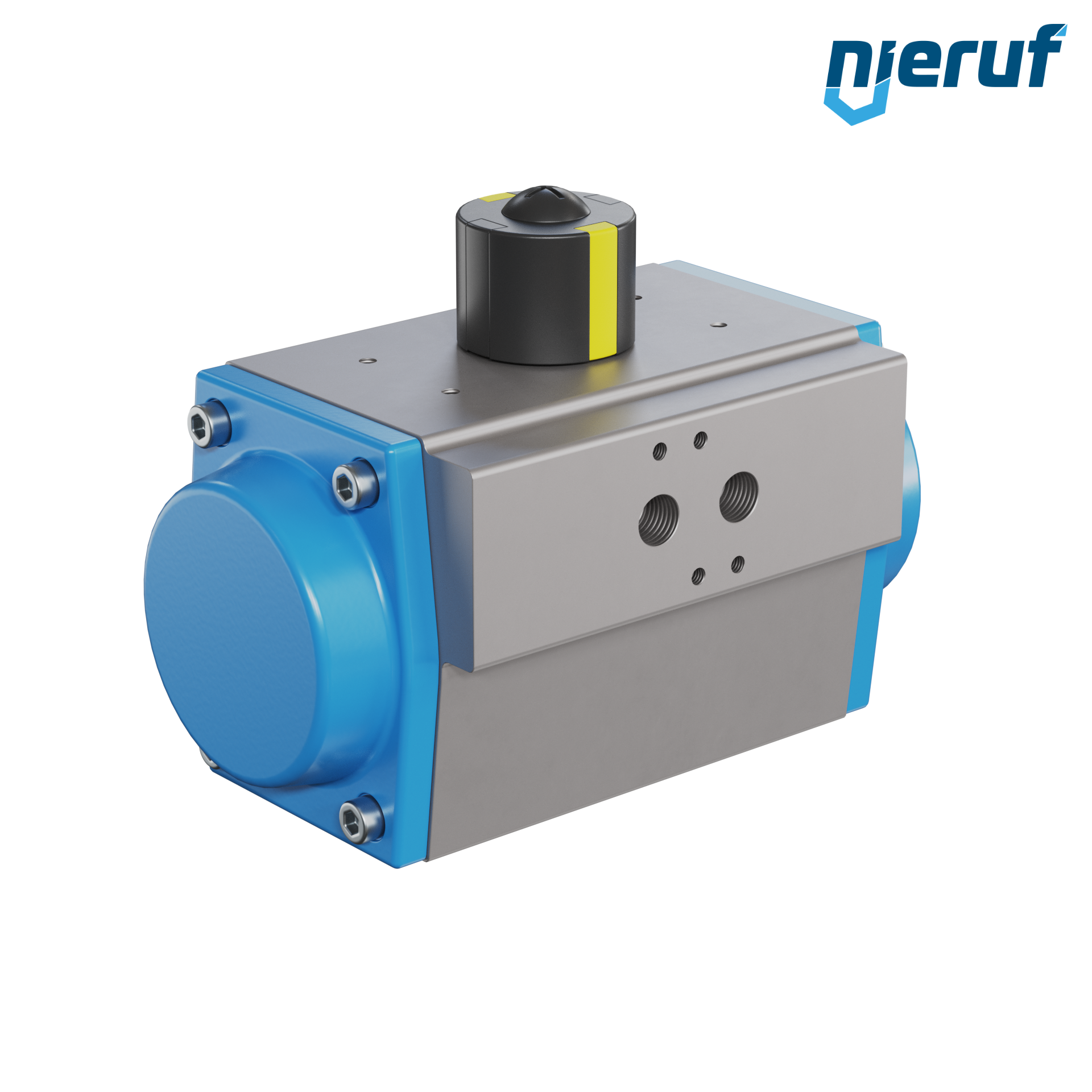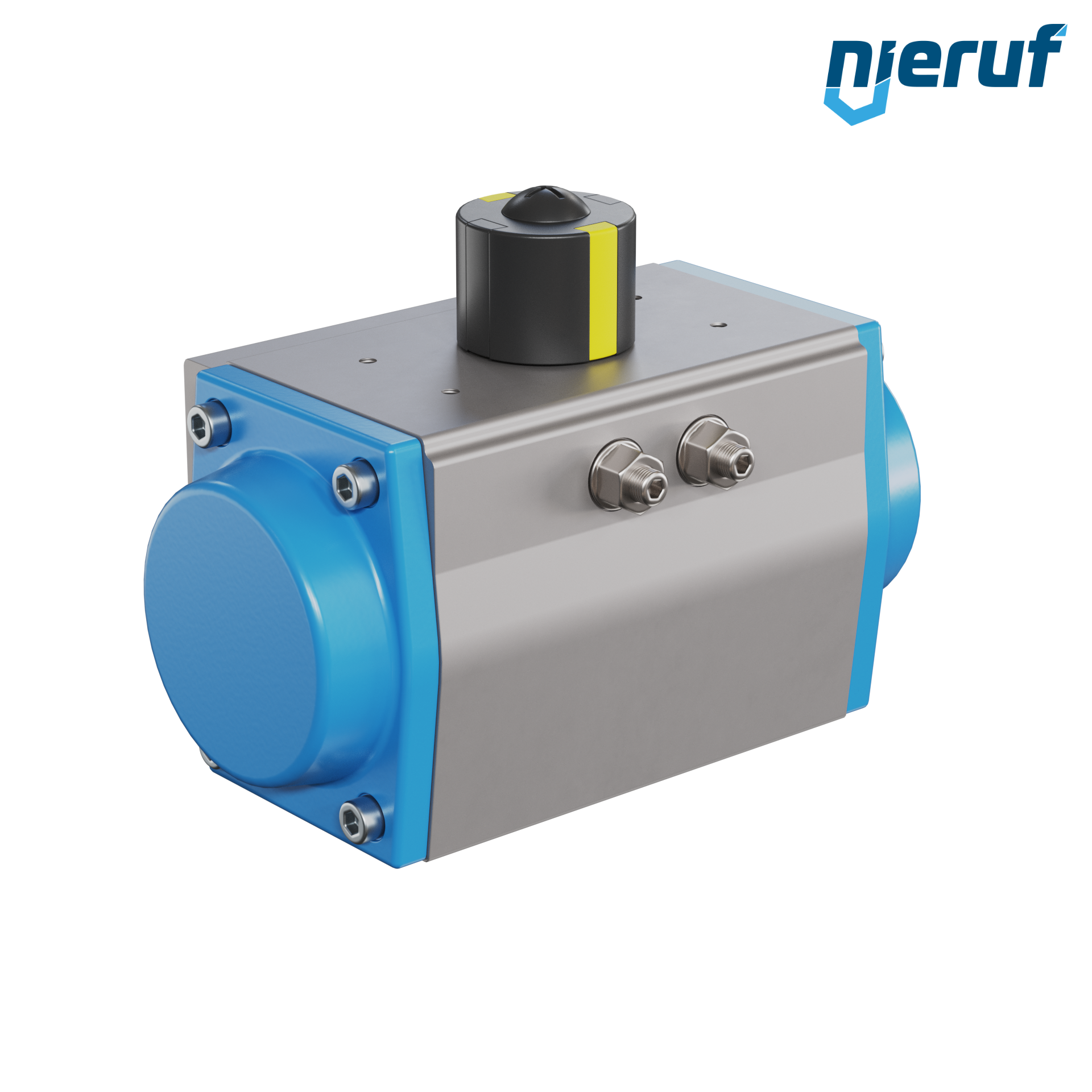 Kompakter, doppeltwirkender, pneumatischer Antrieb zum Steuern und Regeln von Armaturen. Voreingestellter Schwenkwinkel 90° mit optischer Stellungsanzeige.