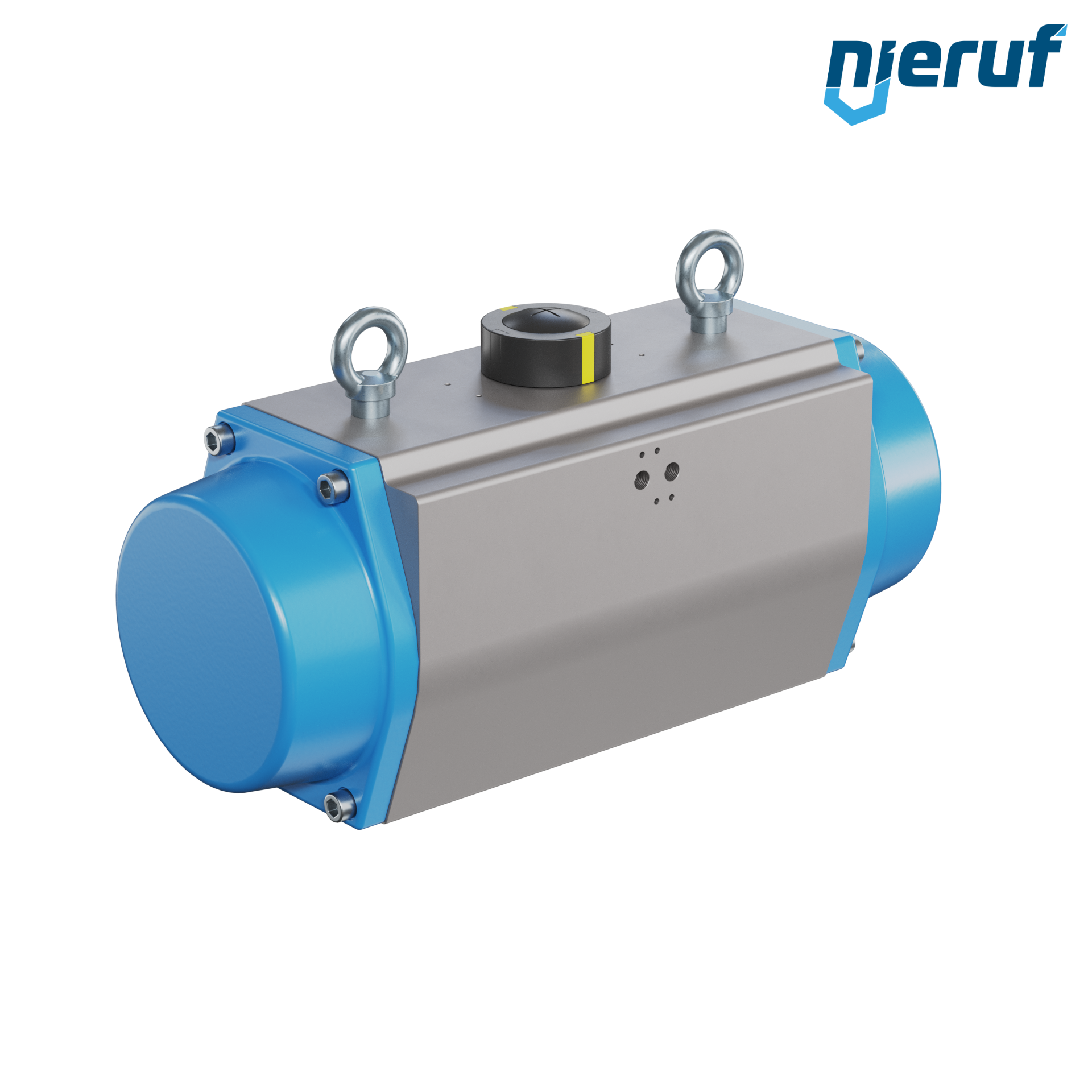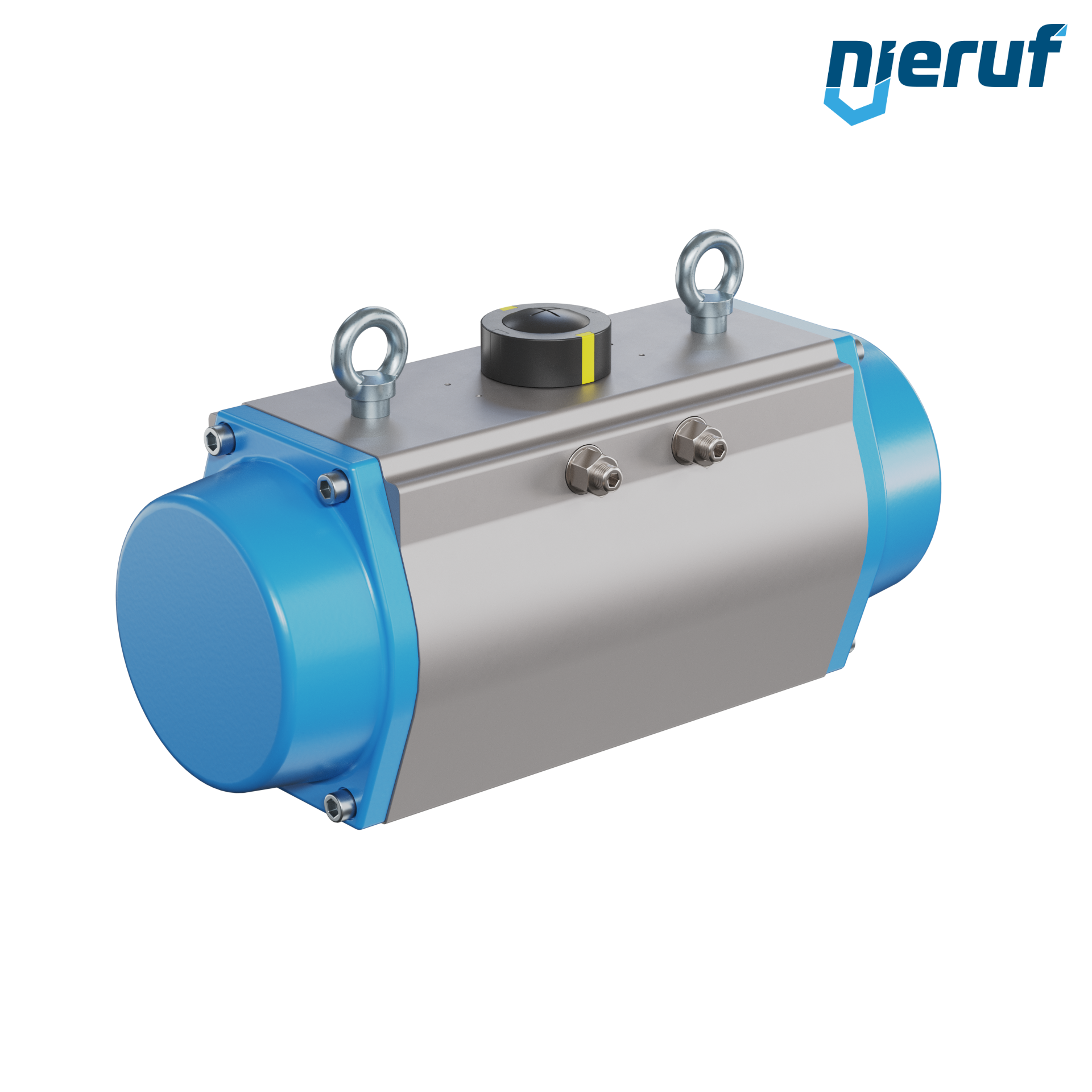 Kompakter, doppeltwirkender, pneumatischer Antrieb zum Steuern und Regeln von Armaturen. Voreingestellter Schwenkwinkel 90° mit optischer Stellungsanzeige.