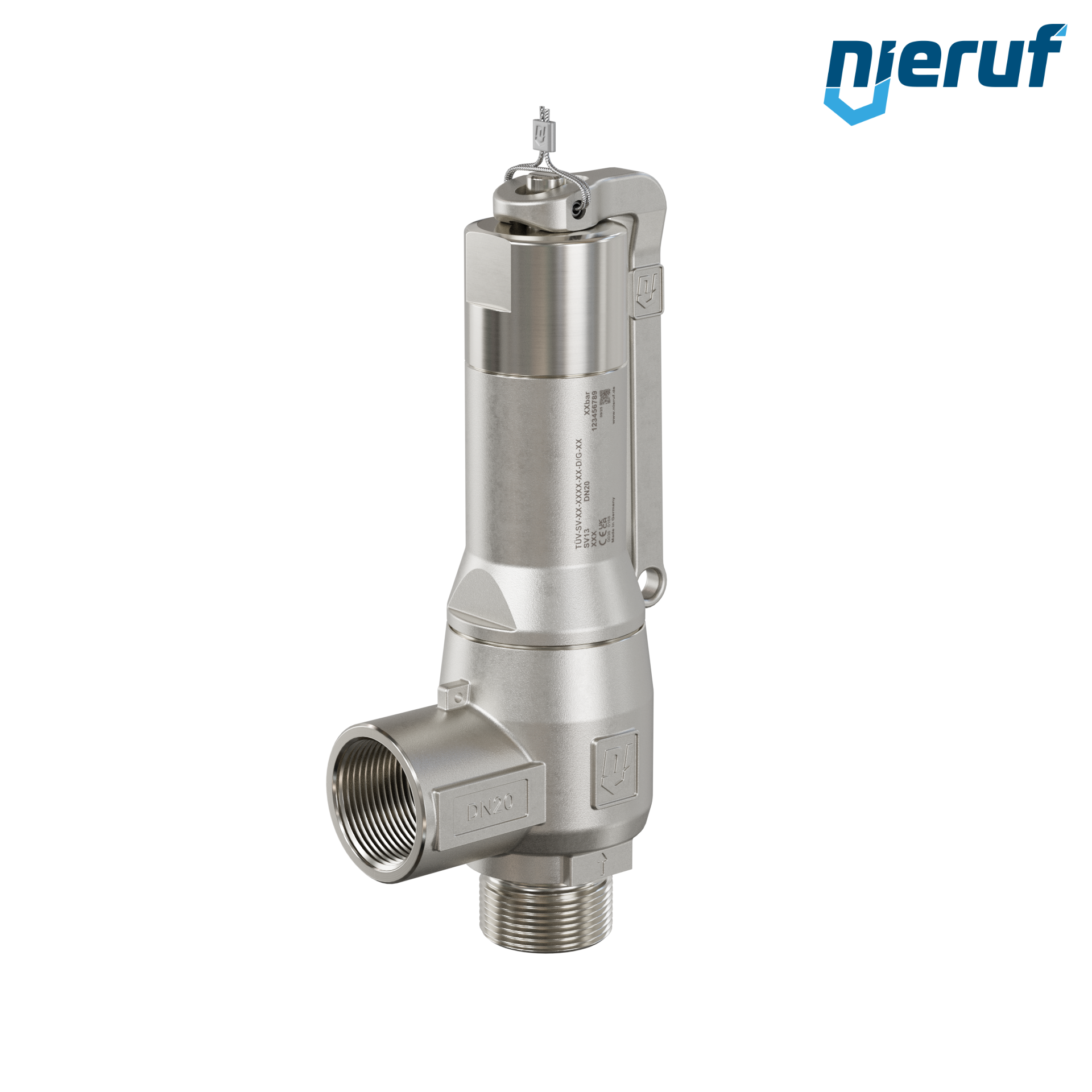 Sicherheitsventil 3/4" AG NPT x 3/4" IG SV13 für flüssige und gasförmige Medien aus Edelstahl Dichtung EPDM Druck 0,2 - 25,0 bar mit Hebel